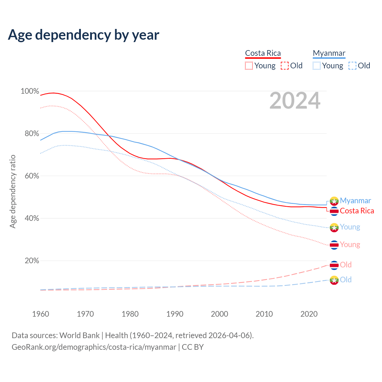 Data sources: World Bank | Health (1960–2024, retrieved 2026-04-06); U.S. Census Bureau (1960–2024, retrieved 2026-02-08).