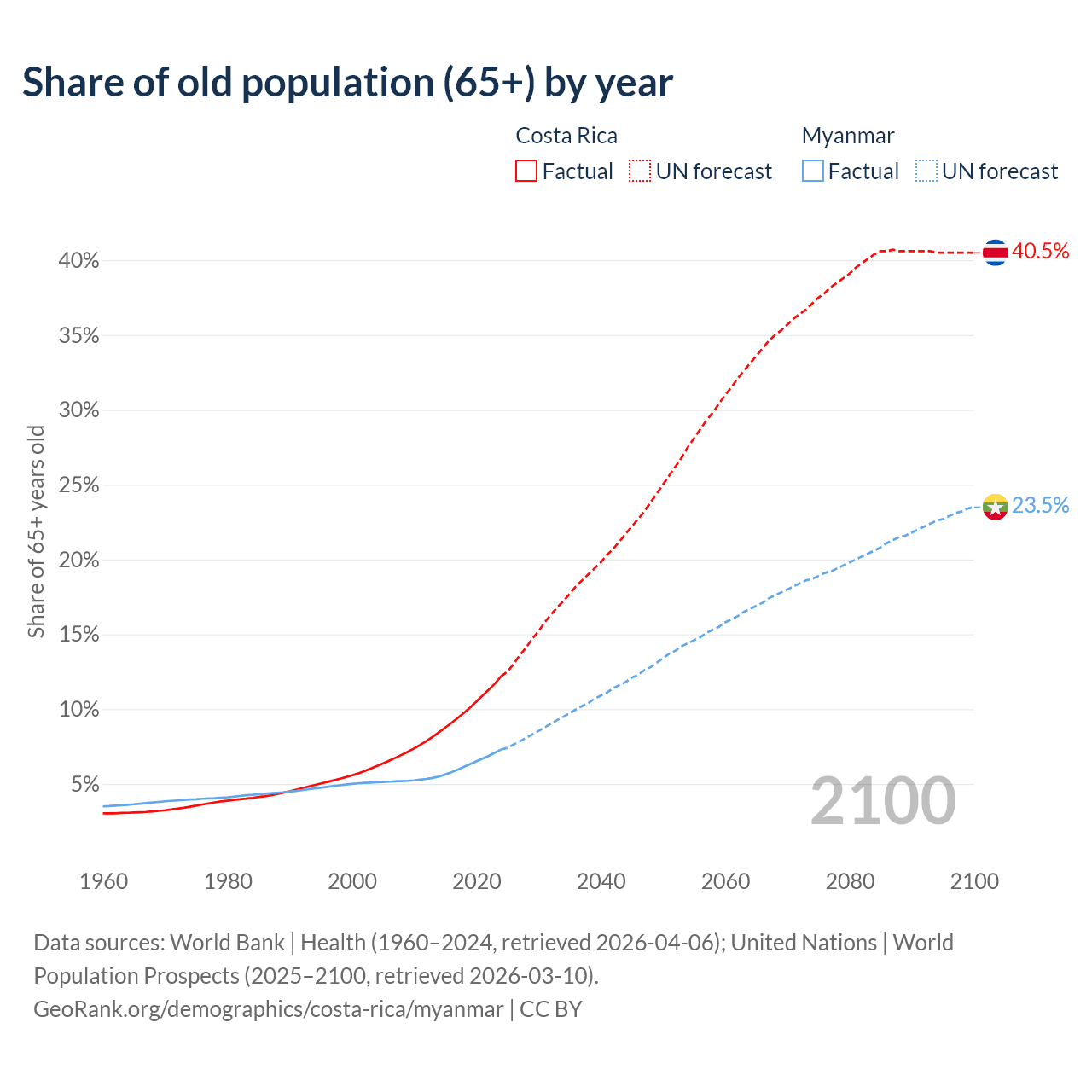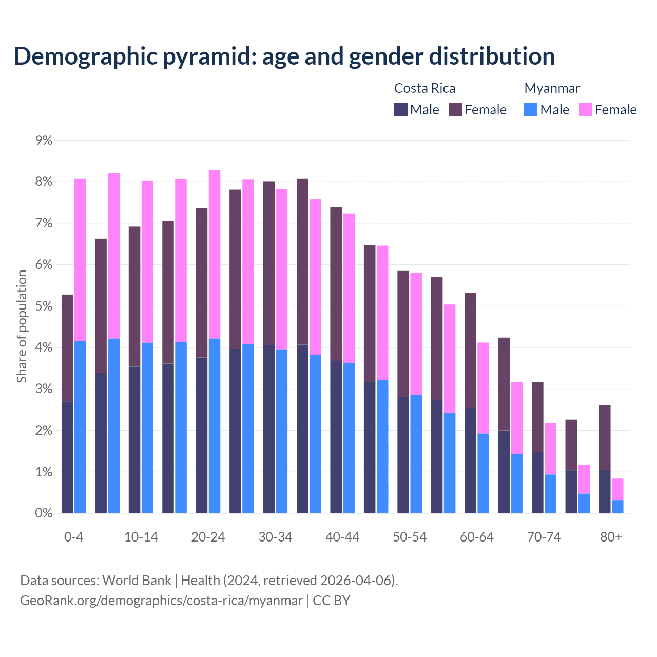 The share of older people aged 65 and over is 12.2% in Costa Rica and 7.3% in Myanmar. Life expectancy in Costa Rica compared to Myanmar .