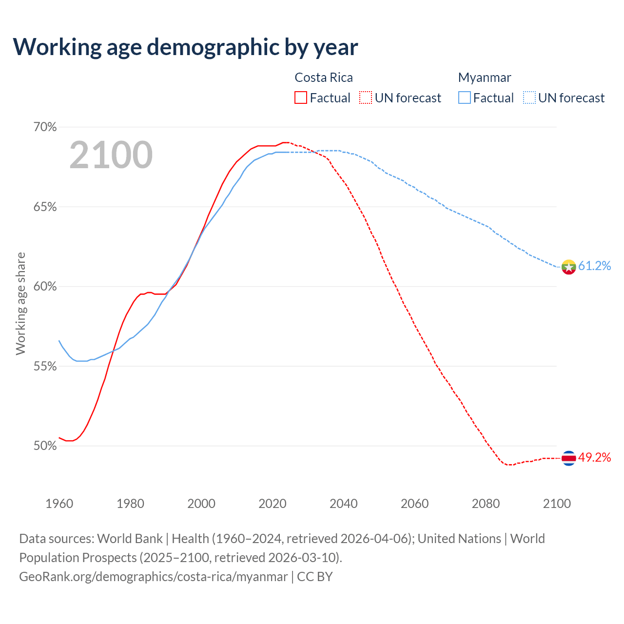 - Costa Rica has 3.57M working age adults (aged 15-64) vs 37.8M in Myanmar.