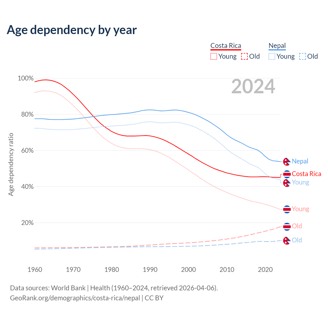 - Costa Rica is ranked 72/196 by median age (oldest to youngest) vs 127/196 for Nepal.