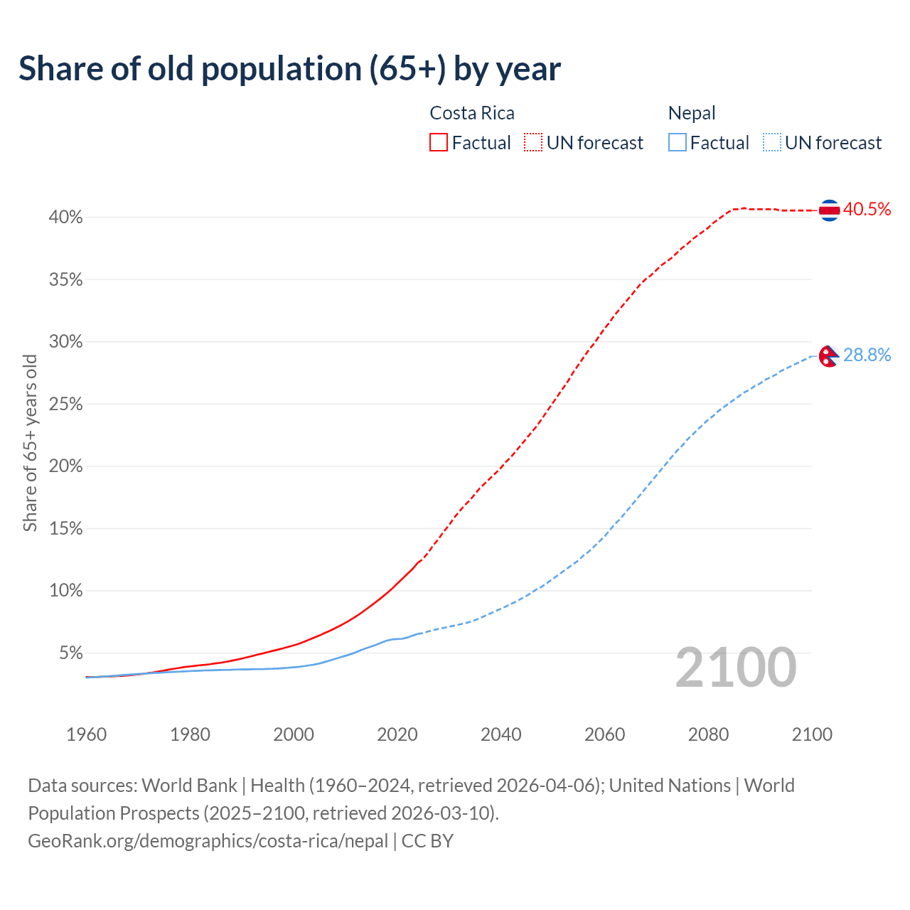 - The share of old-age demographic (65+) in Costa Rica is 12.2% vs 6.5% in Nepal.