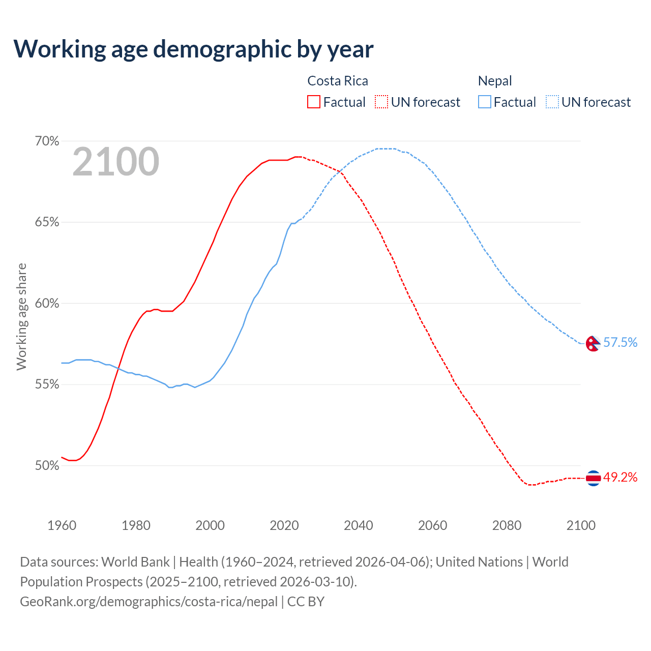 - Costa Rica has 3.57M working age adults (aged 15-64) vs 19.3M in Nepal.