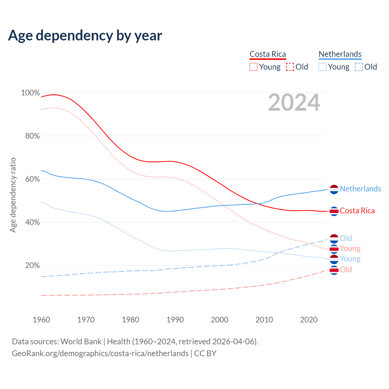 - Costa Rica is ranked 72/196 by median age (oldest to youngest) vs 33/196 for the Netherlands.