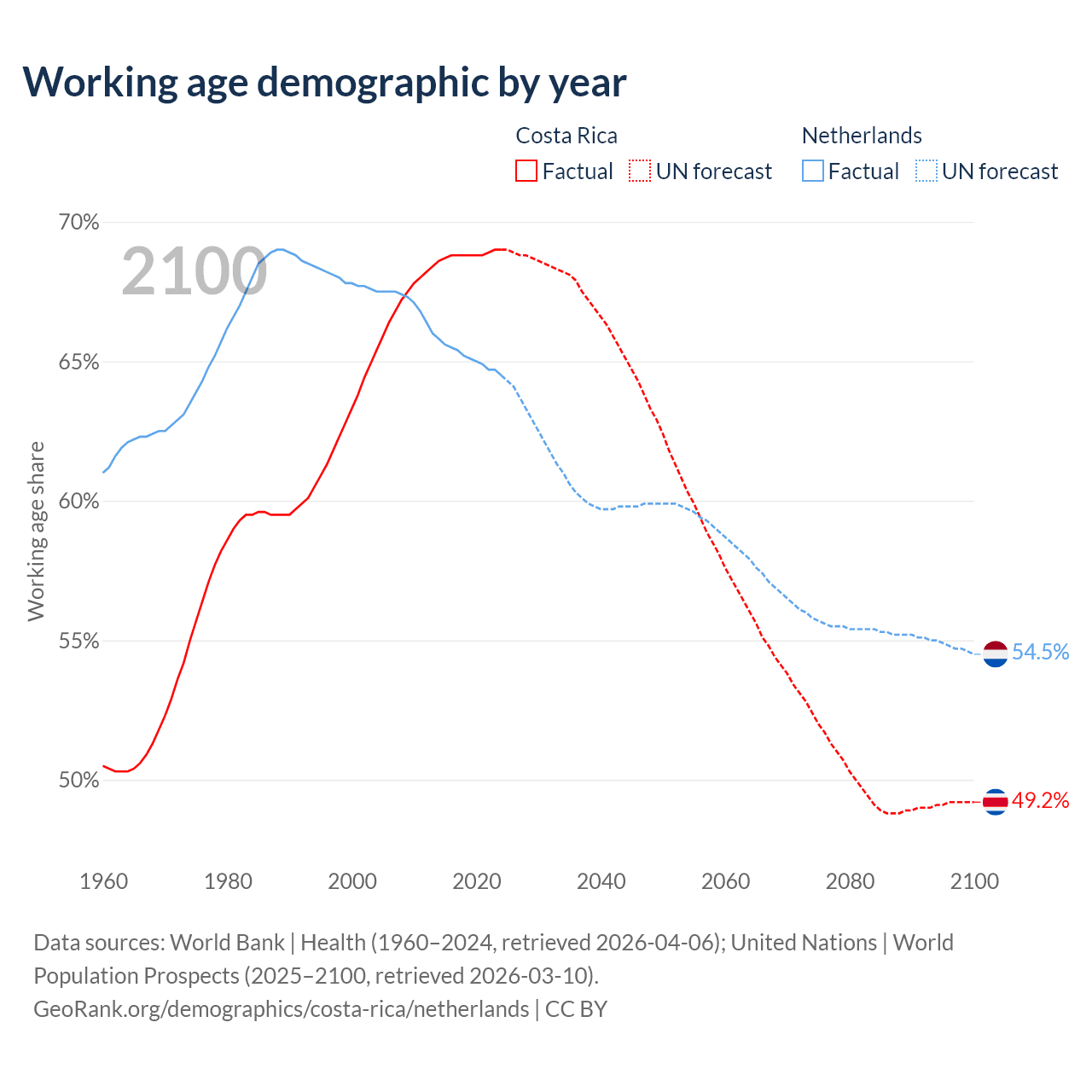 Median age Costa Rica vs Netherlands, 1960-2100