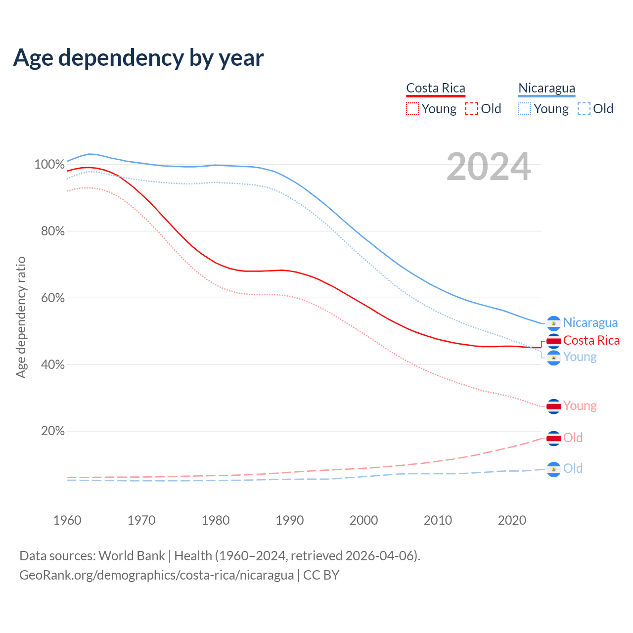 Data sources: World Bank | Health (1960–2024, retrieved 2026-04-06); U.S. Census Bureau (1960–2024, retrieved 2026-02-08).
