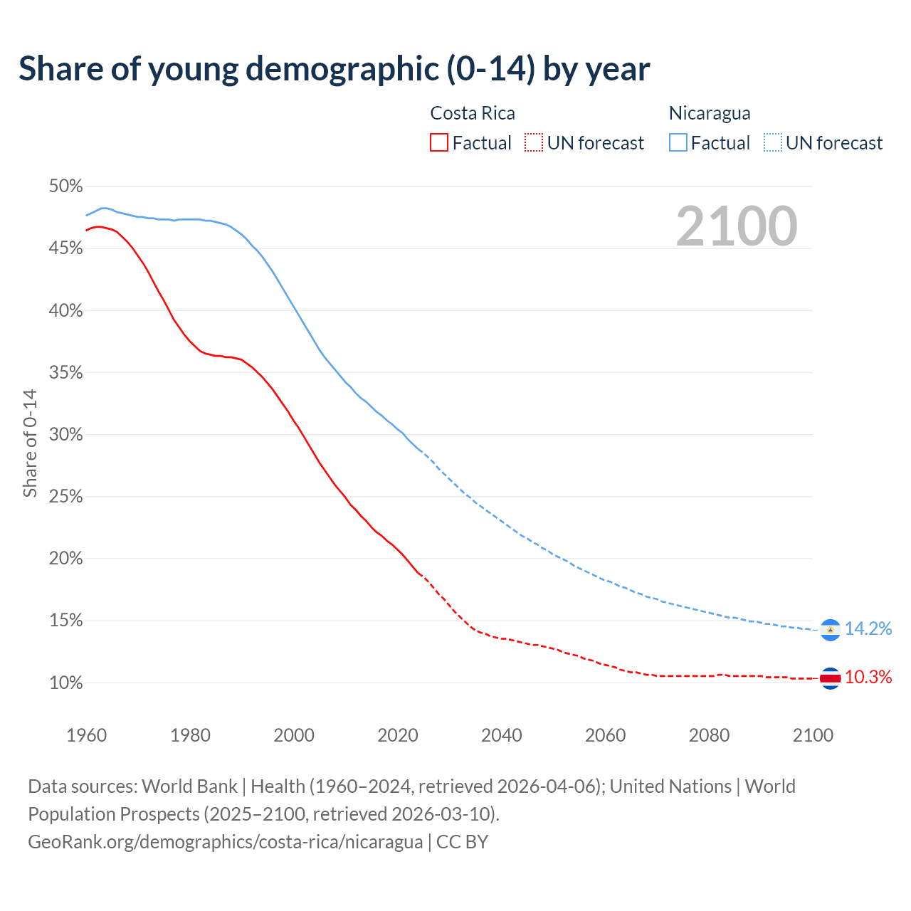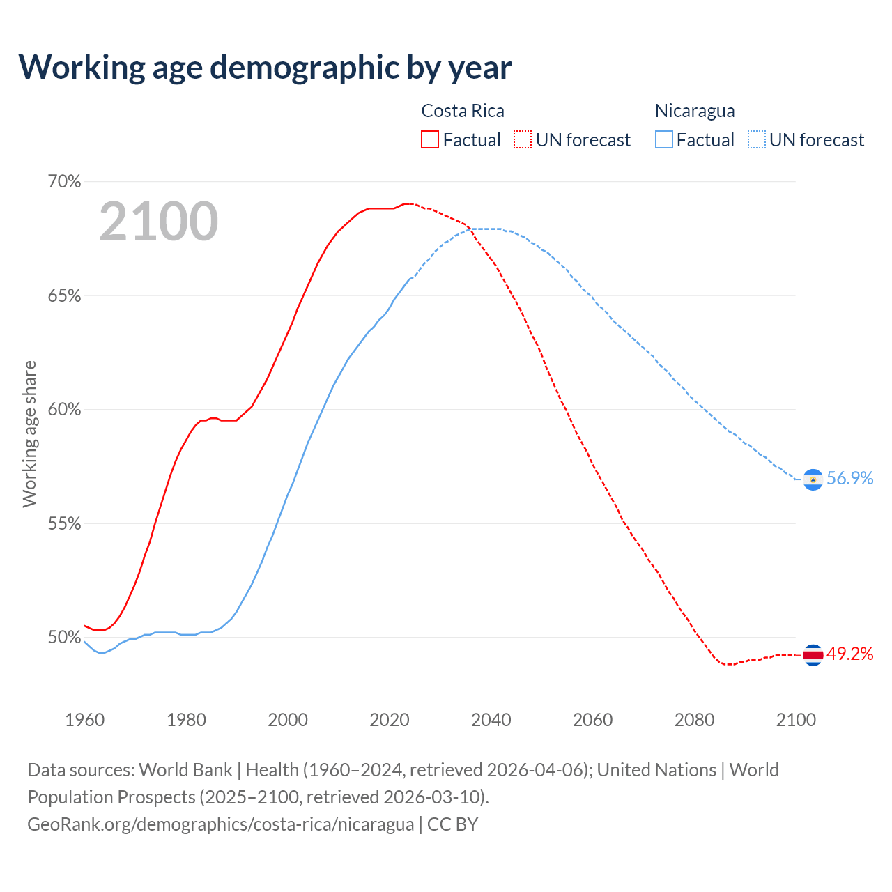 Median age Costa Rica vs Nicaragua, 1960-2100