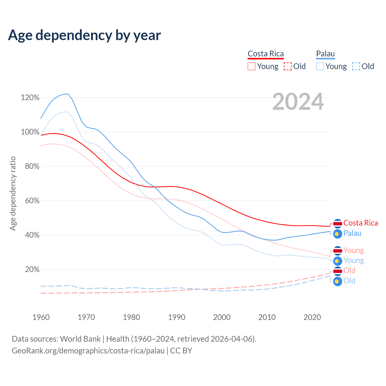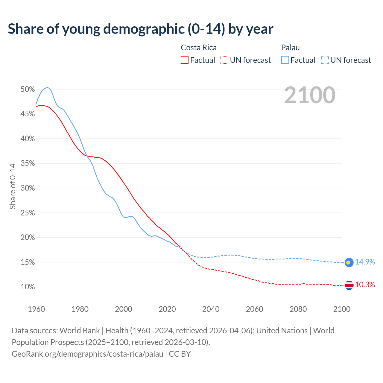 - The share of young demographic (0-15 years old) in Costa Rica is 18.8% vs 18.2% in Palau.