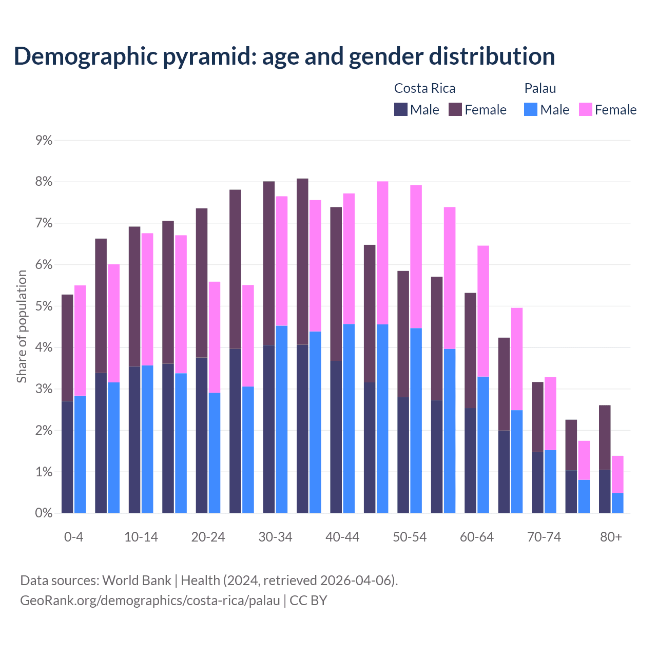 - Costa Rica is ranked 72/196 by median age (oldest to youngest) vs 53/196 for Palau.