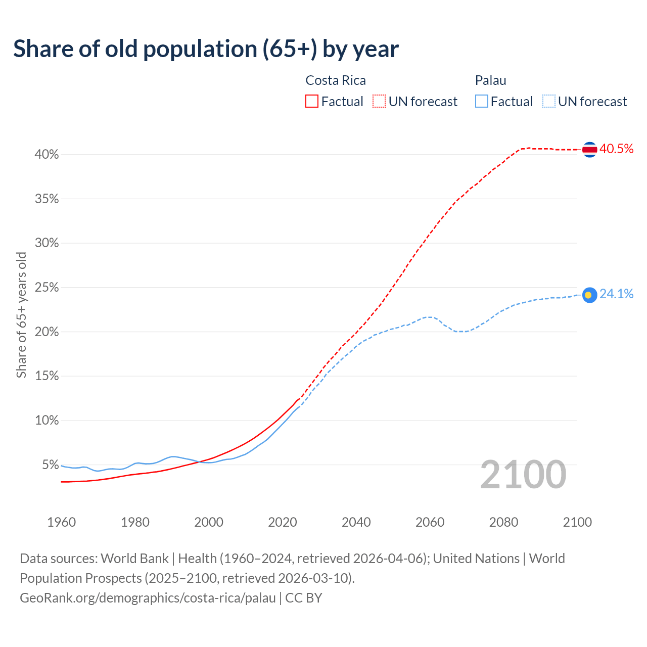 - The share of old-age demographic (65+) in Costa Rica is 12.2% vs 11.3% in Palau.