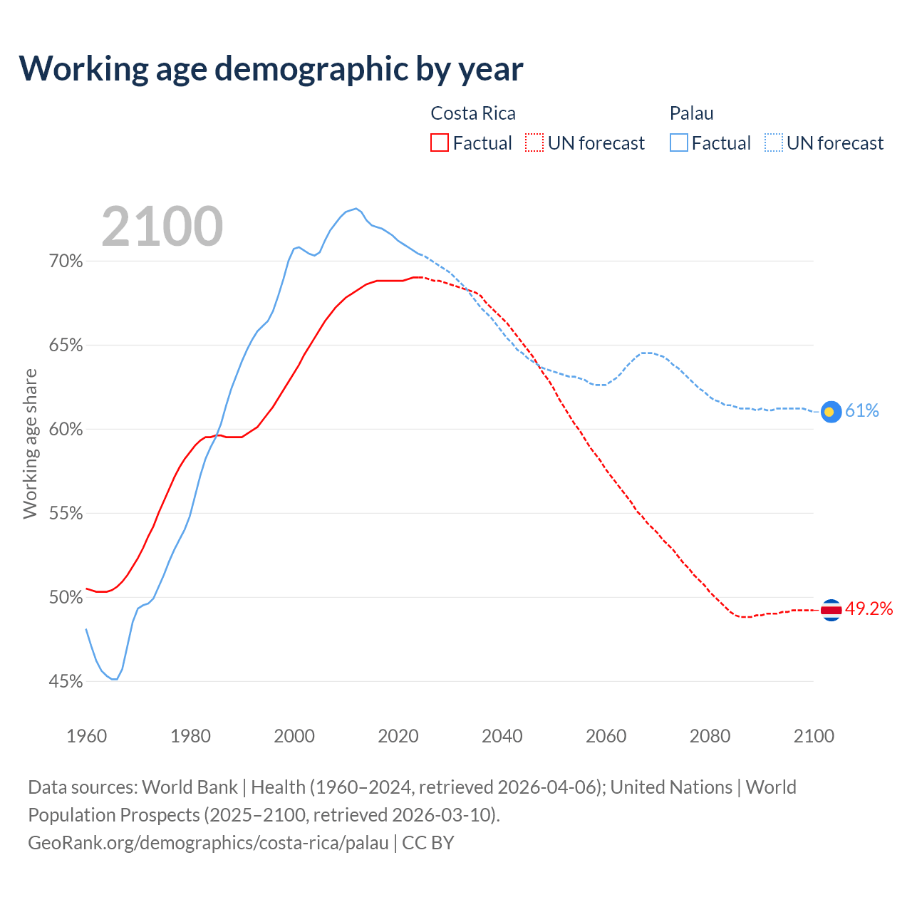 - Costa Rica has 3.57M working age adults (aged 15-64) vs 12.4K in Palau.
