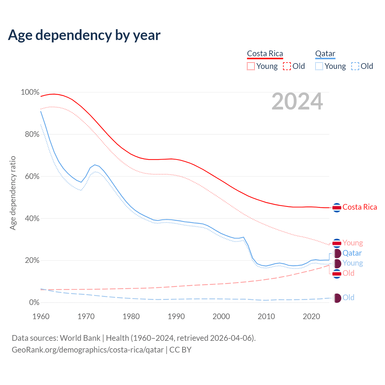 - Costa Rica is ranked 72/196 by median age (oldest to youngest) vs 78/196 for Qatar.
