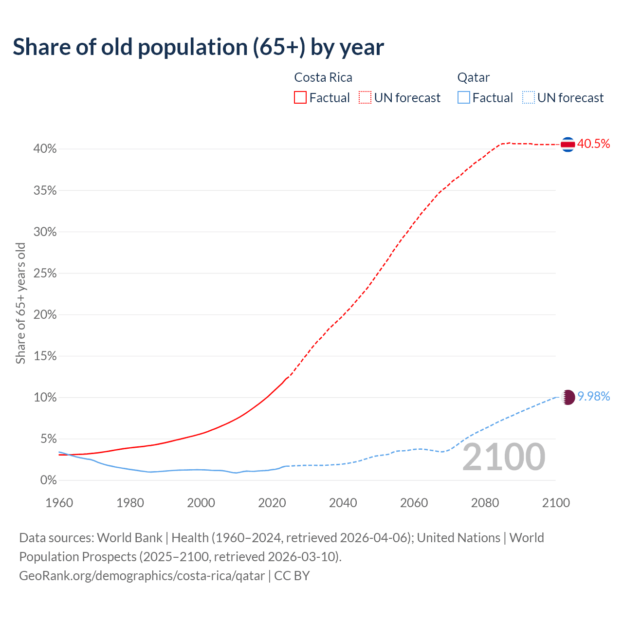 The share of older people aged 65 and over is 12.2% in Costa Rica and 1.68% in Qatar. Life expectancy in Costa Rica compared to Qatar .
