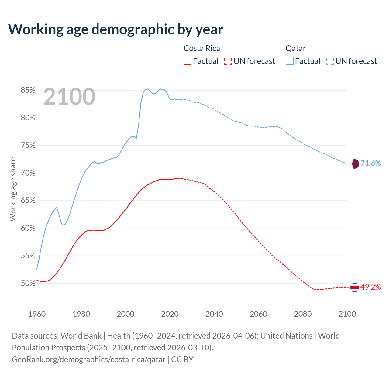 - Costa Rica has 3.57M working age adults (aged 15-64) vs 2.5M in Qatar.