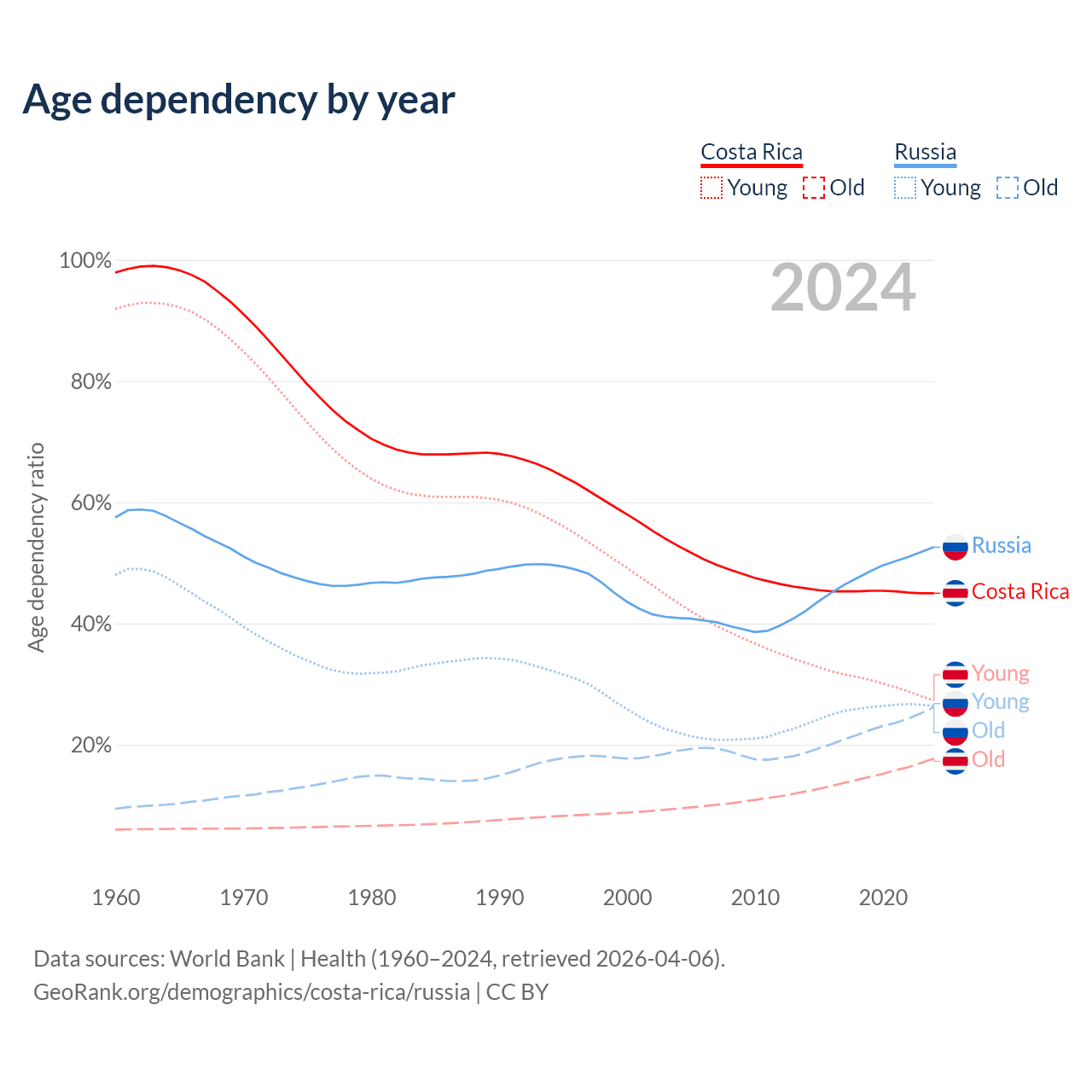- Costa Rica is ranked 72/196 by median age (oldest to youngest) vs 42/196 for Russia.