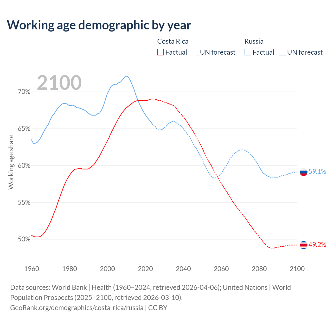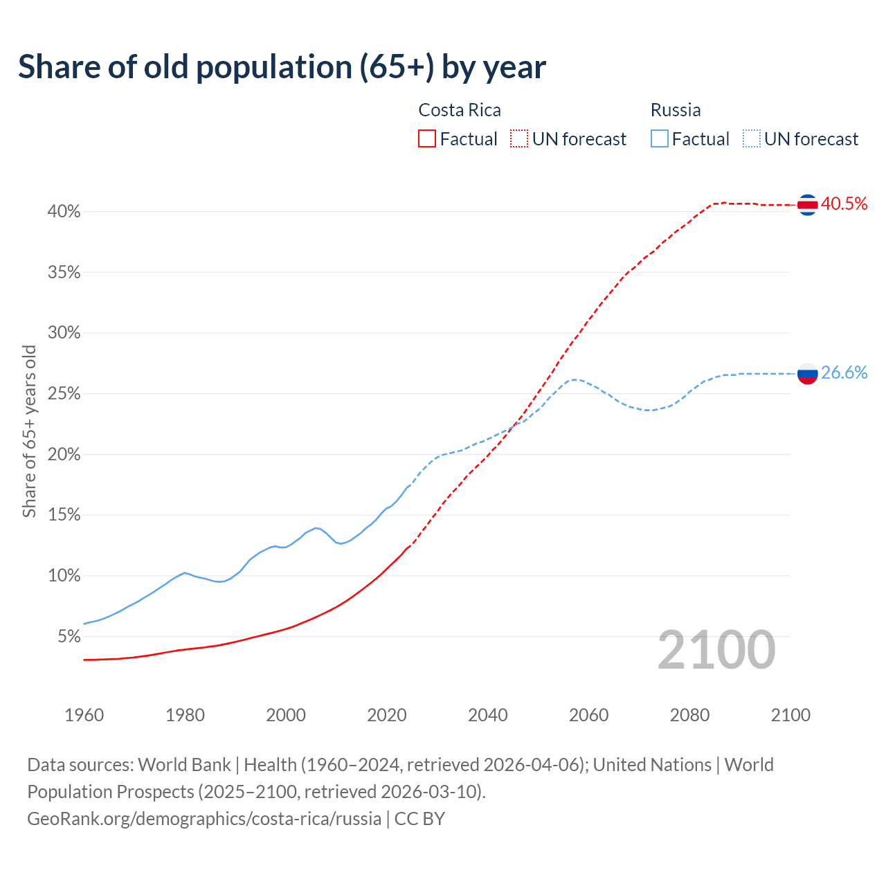 Median age Costa Rica vs Russia, 1960-2100