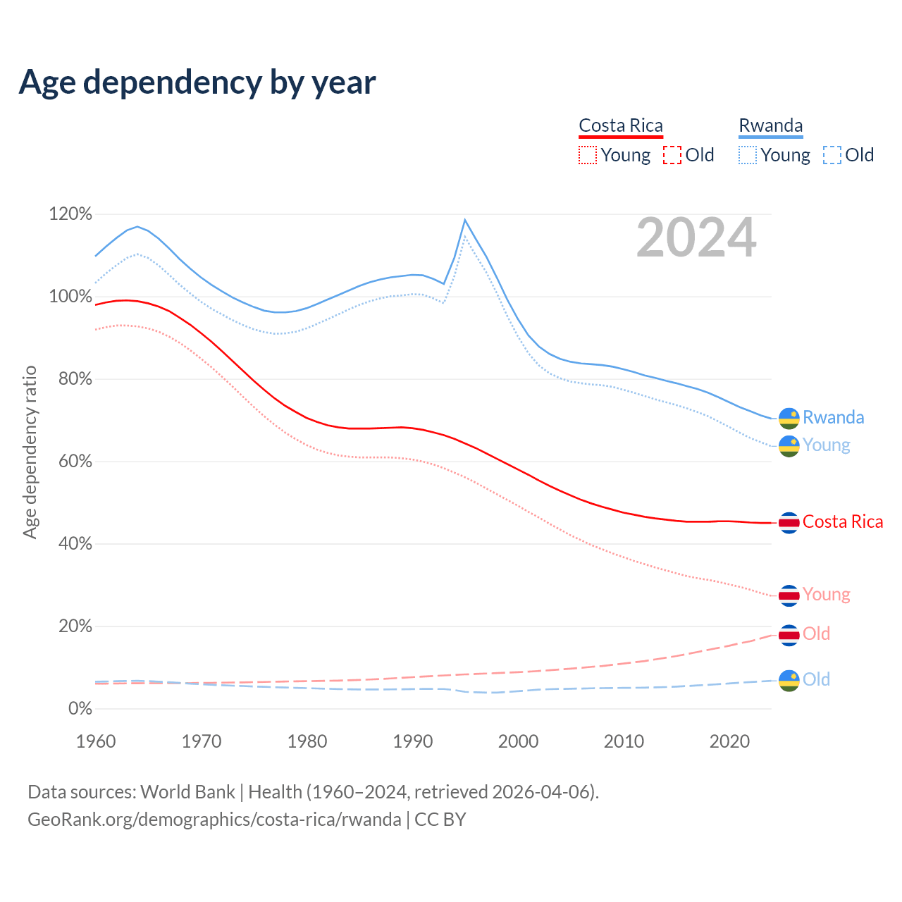 Data sources: World Bank | Health (1960–2024, retrieved 2026-04-06); U.S. Census Bureau (1960–2024, retrieved 2026-02-08).