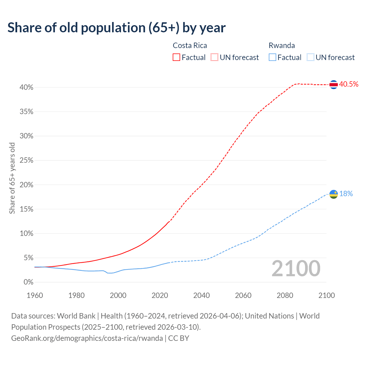 The share of older people aged 65 and over is 12.2% in Costa Rica and 3.93% in Rwanda. Life expectancy in Costa Rica compared to Rwanda .