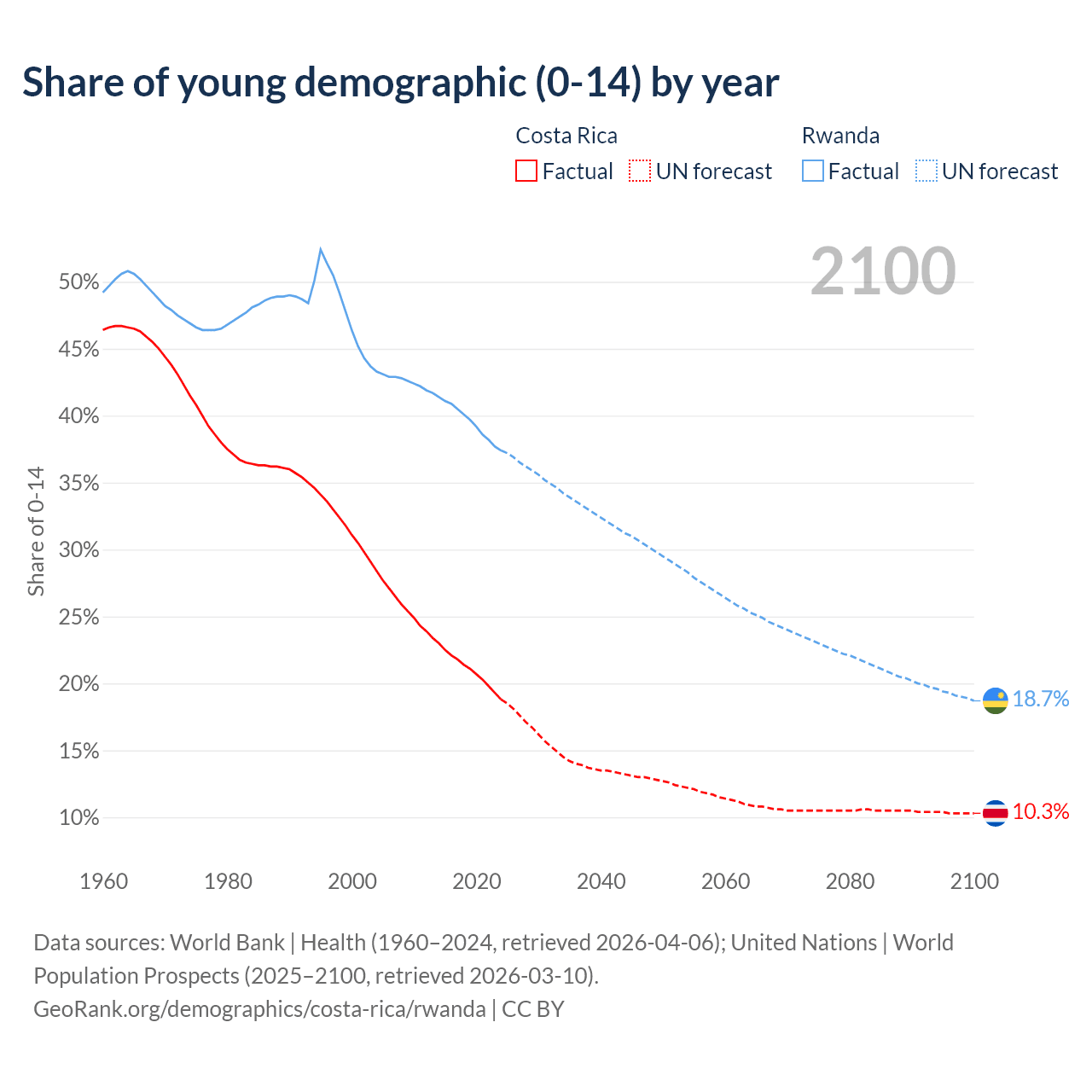 - The share of young demographic (0-15 years old) in Costa Rica is 18.8% vs 37.4% in Rwanda.