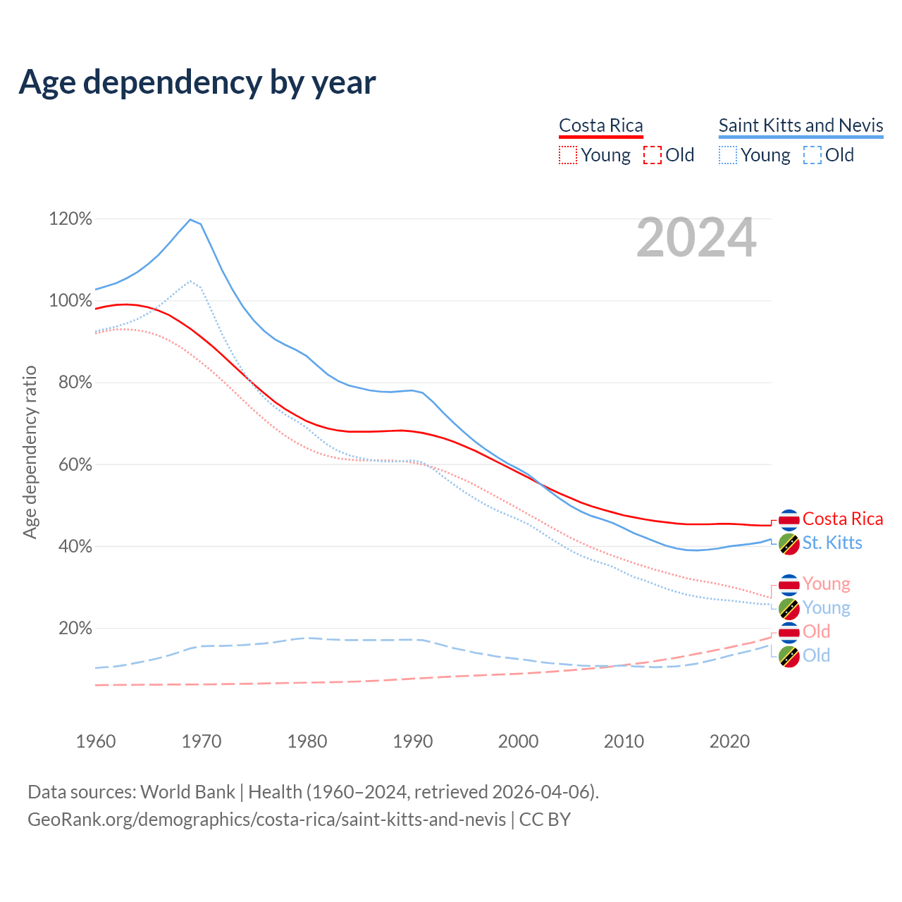 Data sources: World Bank | Health (1960–2024, retrieved 2026-04-06); U.S. Census Bureau (1960–2024, retrieved 2026-02-08).