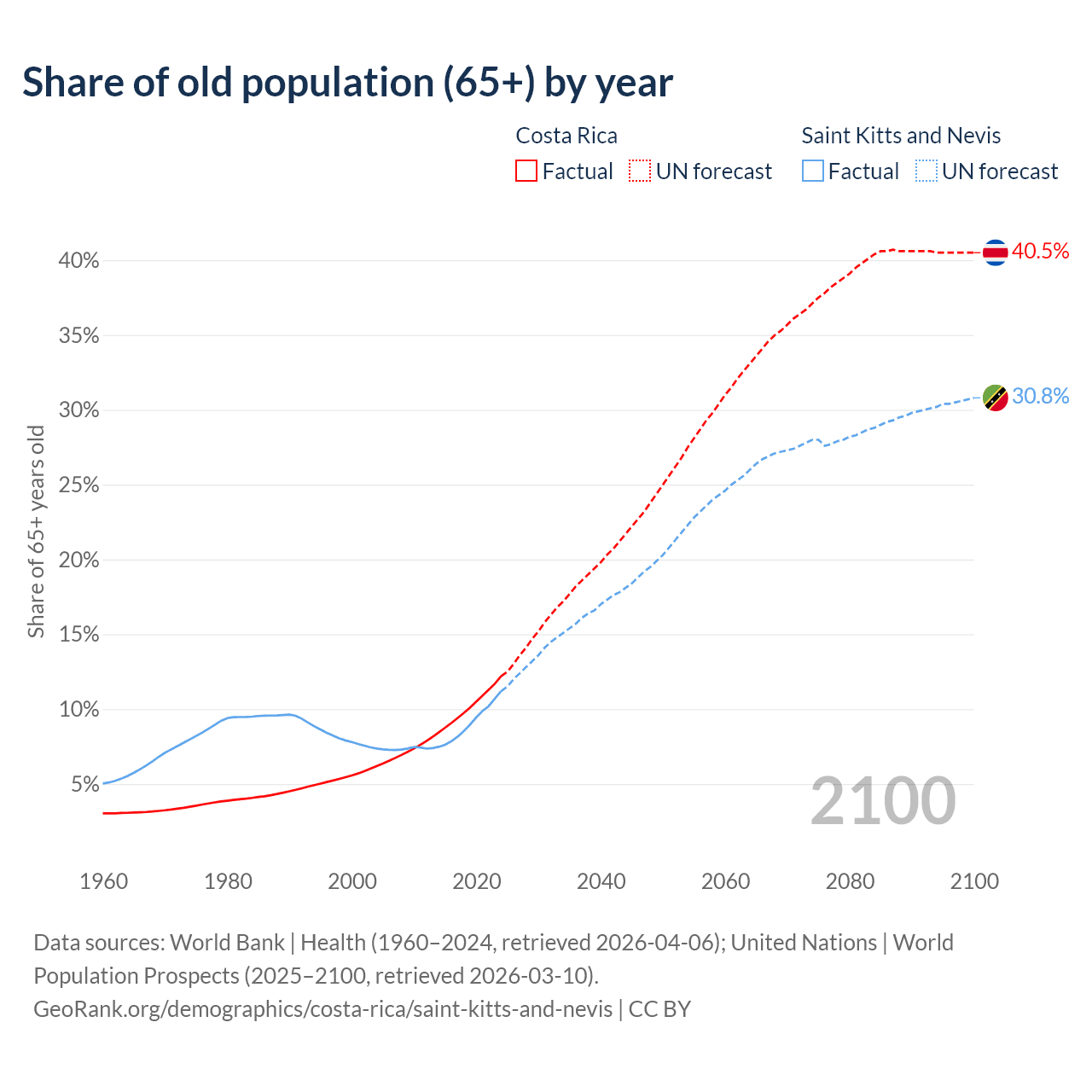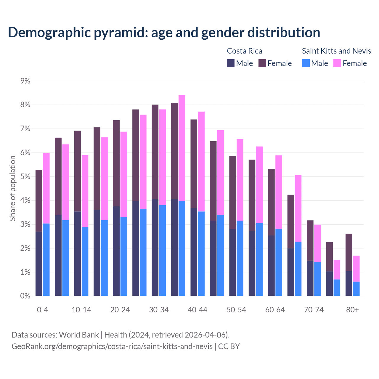 The share of older people aged 65 and over is 12.2% in Costa Rica and 11.2% in Saint Kitts and Nevis. Life expectancy in Costa Rica compared to Saint Kitts and Nevis .