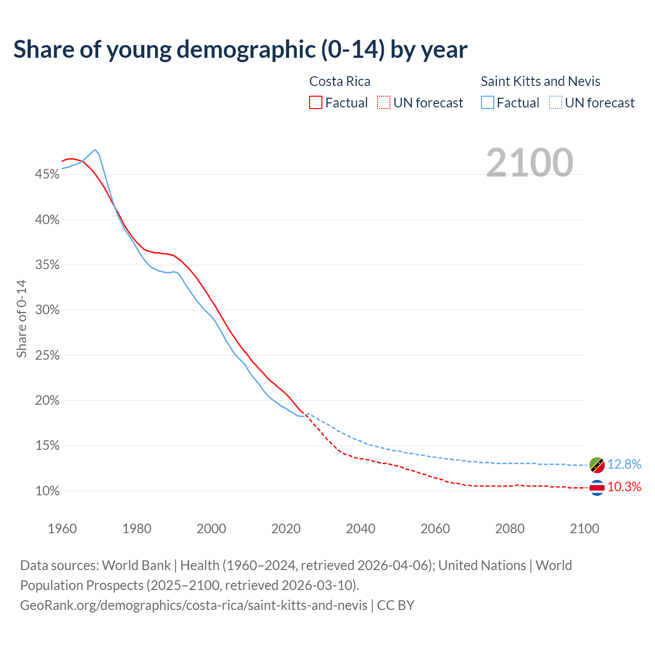 - The share of young demographic (0-15 years old) in Costa Rica is 18.8% vs 18.2% in Saint Kitts and Nevis.