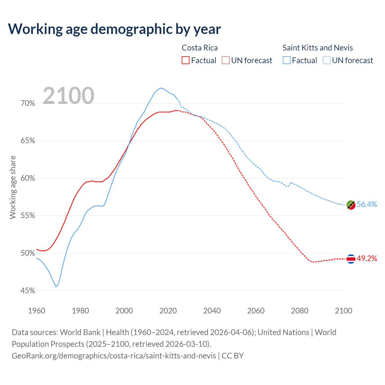 - Costa Rica has 3.57M working age adults (aged 15-64) vs 33.2K in Saint Kitts and Nevis.