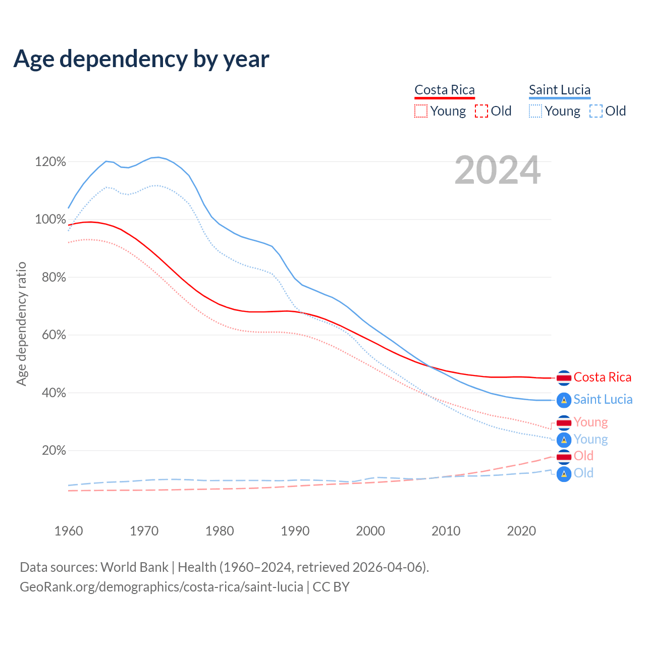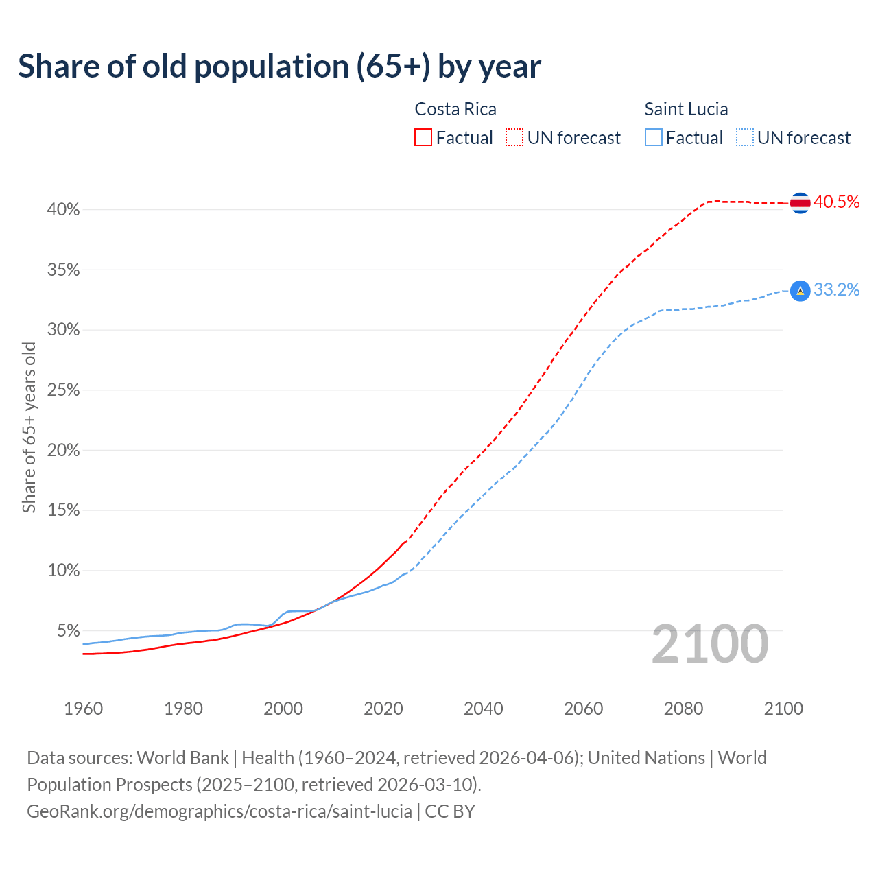 The share of older people aged 65 and over is 12.2% in Costa Rica and 9.62% in Saint Lucia. Life expectancy in Costa Rica compared to Saint Lucia .