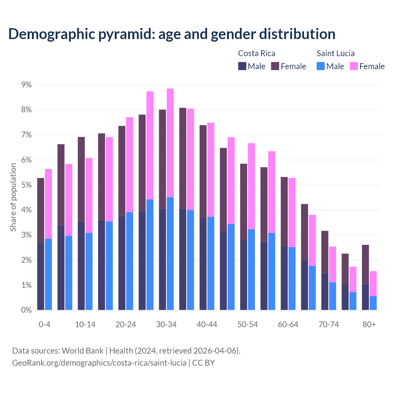 - Costa Rica is ranked 72/196 by median age (oldest to youngest) vs 74/196 for Saint Lucia.