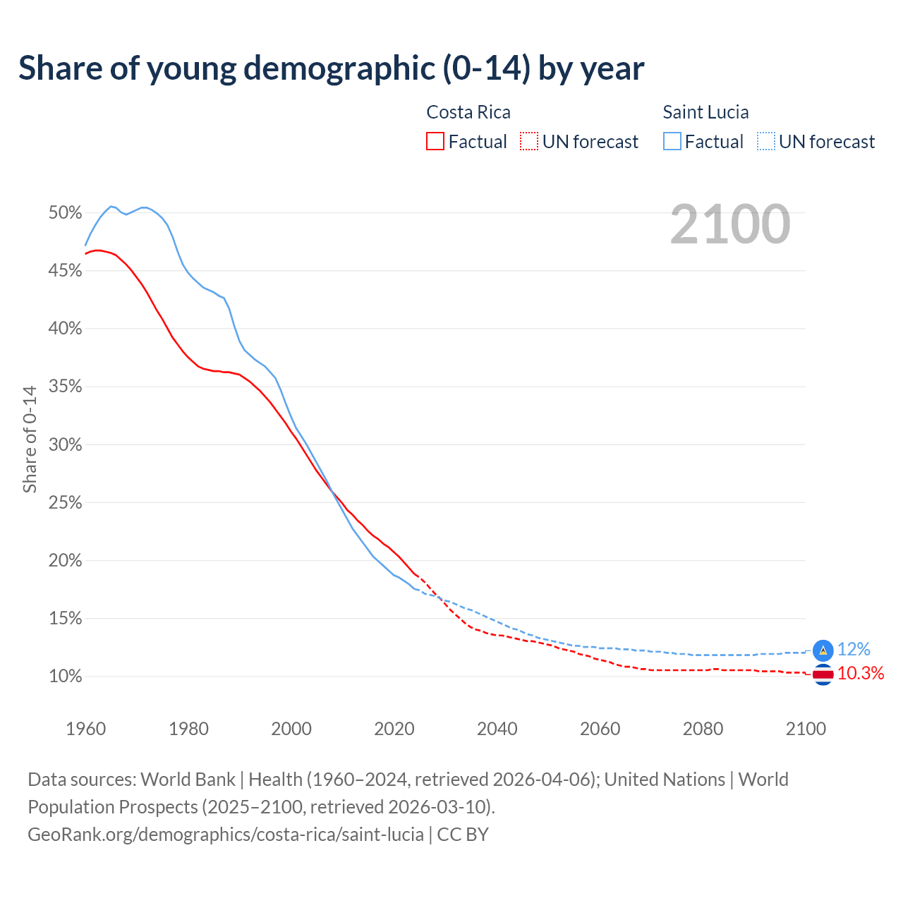 - The share of young demographic (0-15 years old) in Costa Rica is 18.8% vs 17.5% in Saint Lucia.
