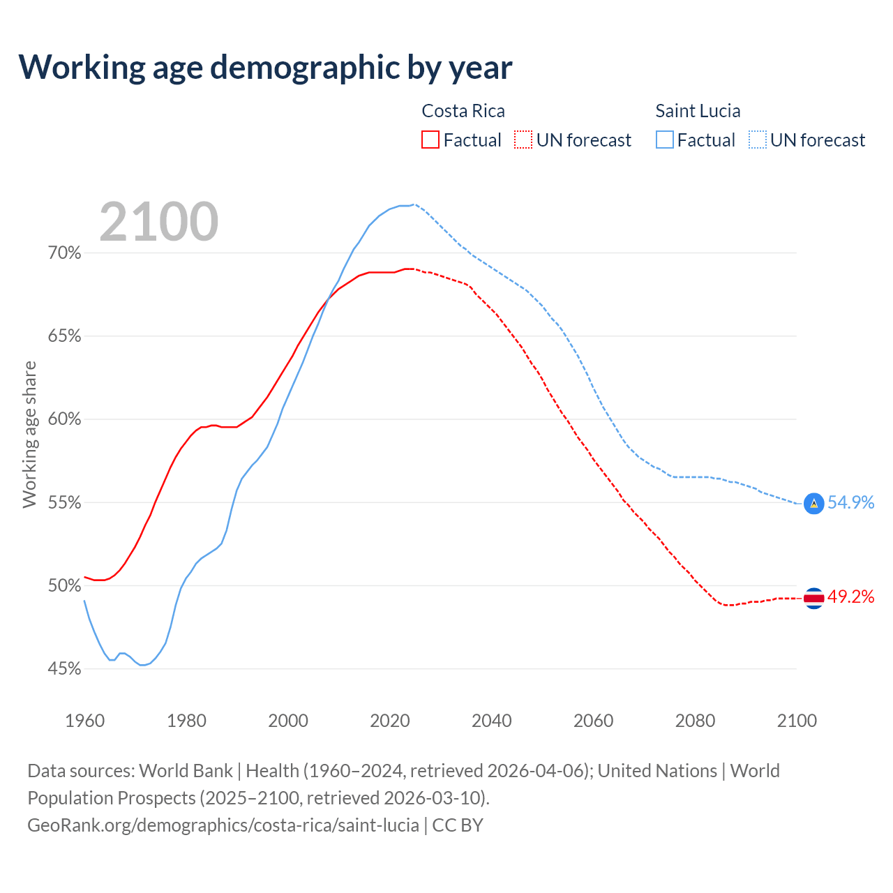 - Costa Rica has 3.57M working age adults (aged 15-64) vs 132K in Saint Lucia.