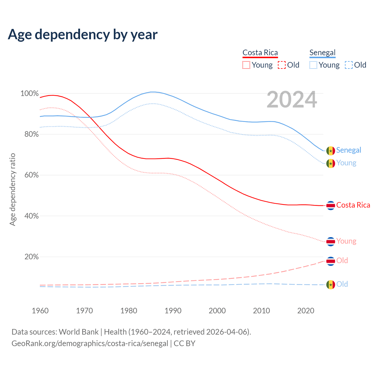 - Costa Rica is ranked 72/196 by median age (oldest to youngest) vs 162/196 for Senegal.