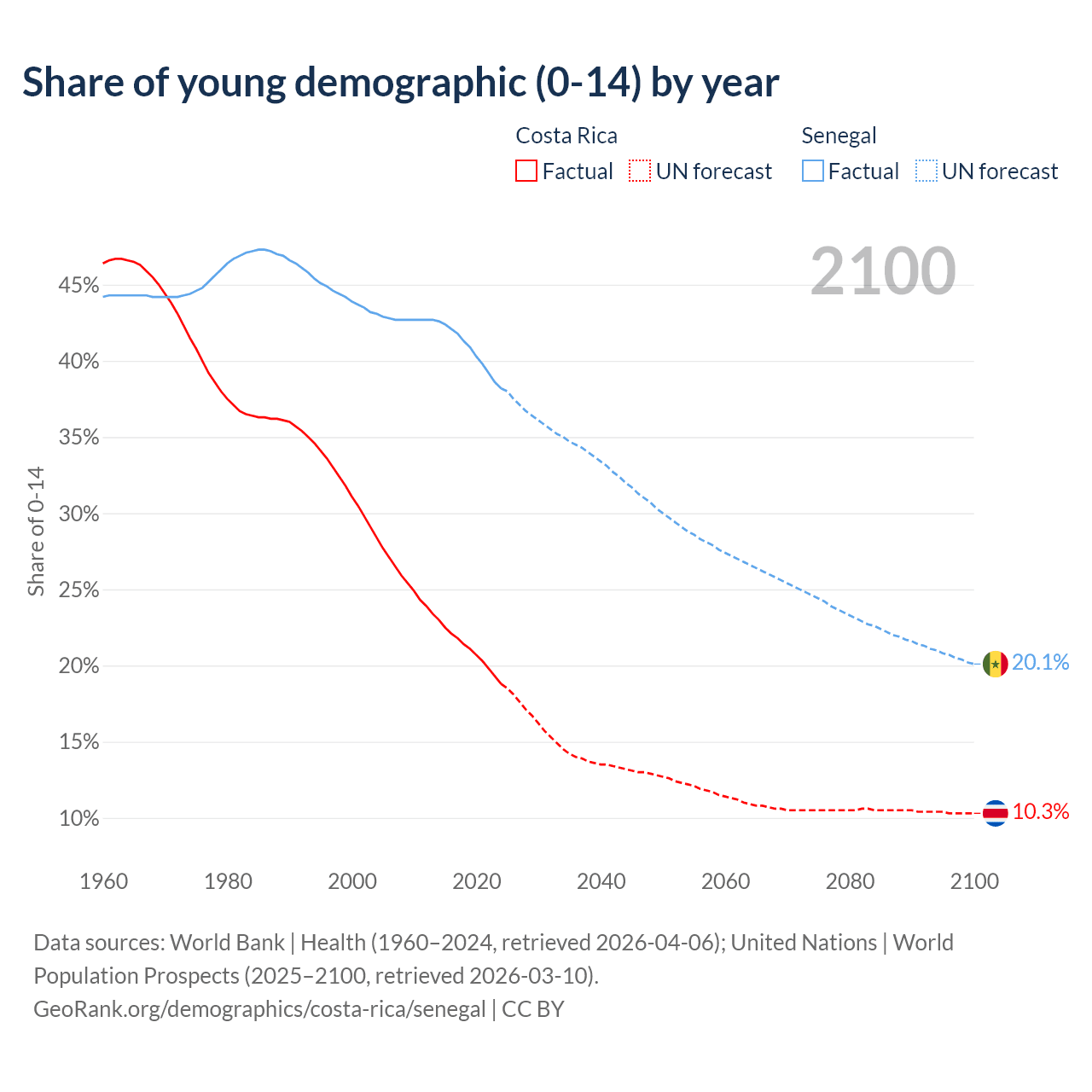 - The share of young demographic (0-15 years old) in Costa Rica is 18.8% vs 38.2% in Senegal.