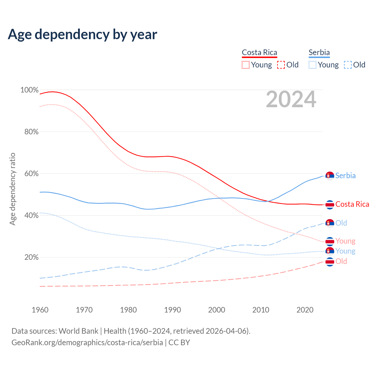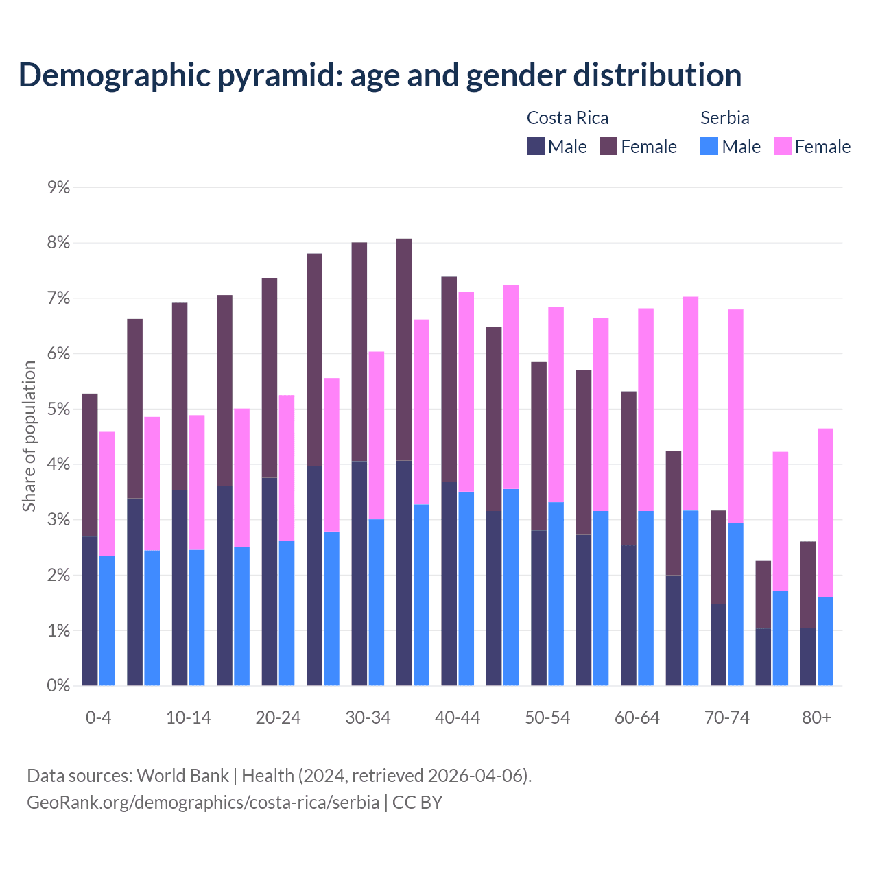 - Costa Rica is ranked 72/196 by median age (oldest to youngest) vs 15/196 for Serbia.