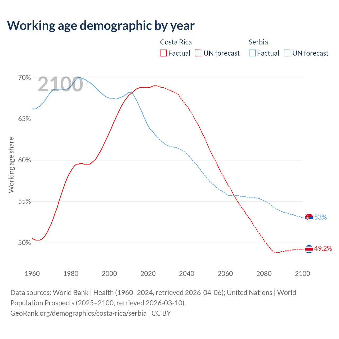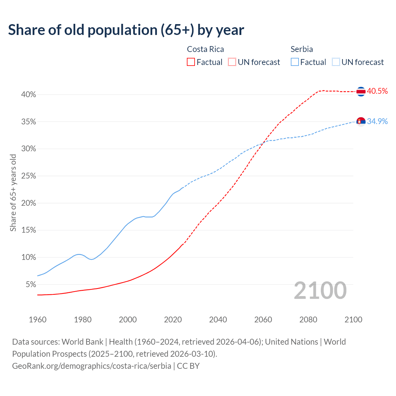 Median age Costa Rica vs Serbia, 1960-2100