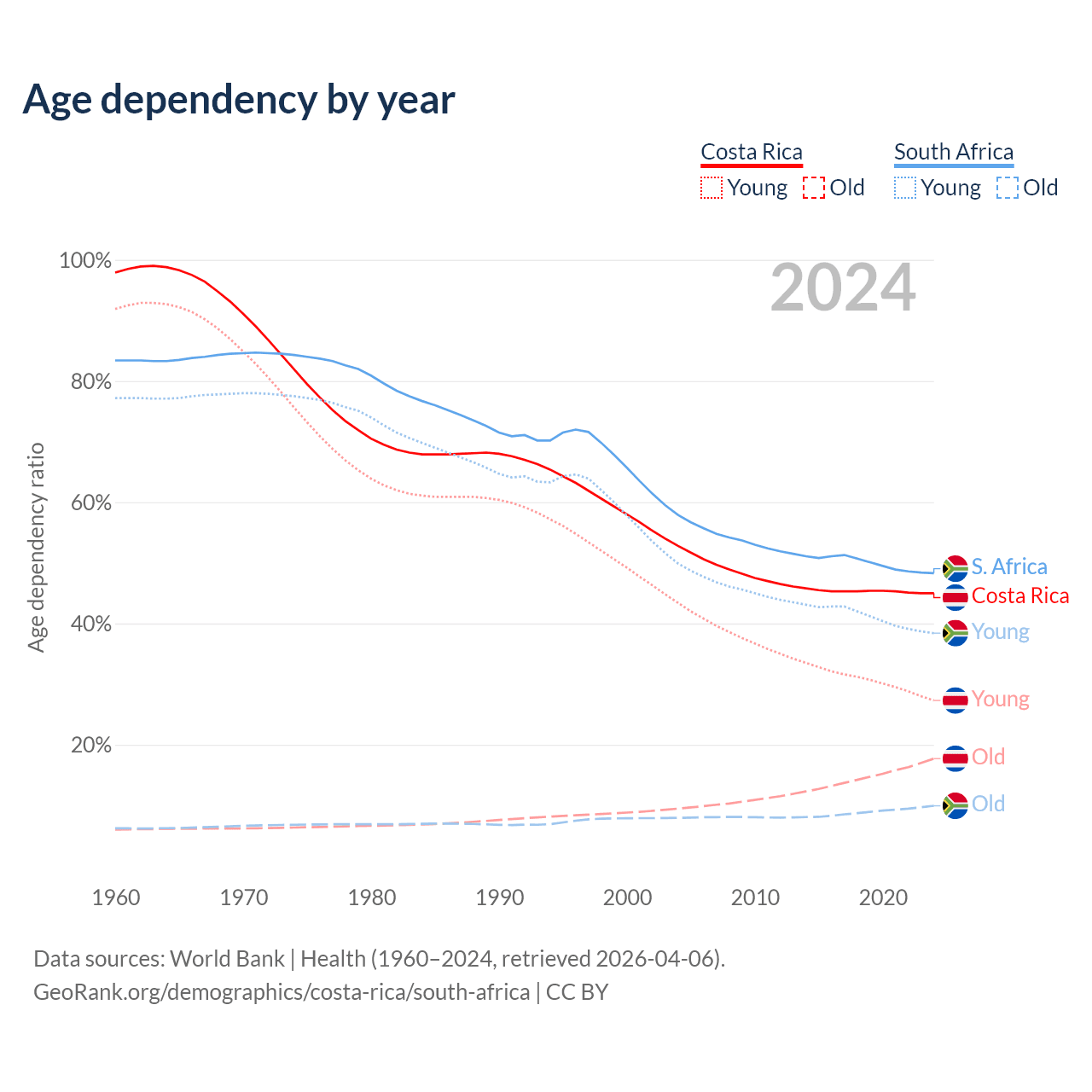 - Costa Rica is ranked 72/196 by median age (oldest to youngest) vs 107/196 for South Africa.