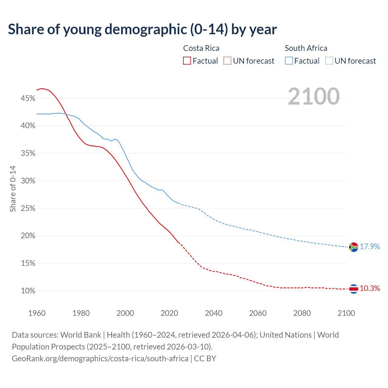 - The total fertility rate is 1.33 in Costa Rica compared to 2.22 in South Africa.