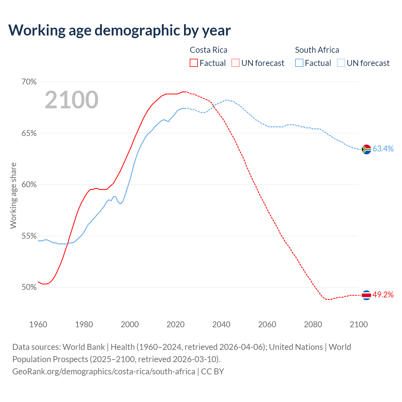 Median age Costa Rica vs South Africa, 1960-2100
