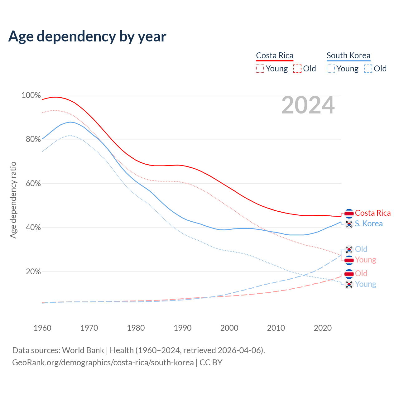 - Costa Rica is ranked 72/196 by median age (oldest to youngest) vs 10/196 for South Korea.