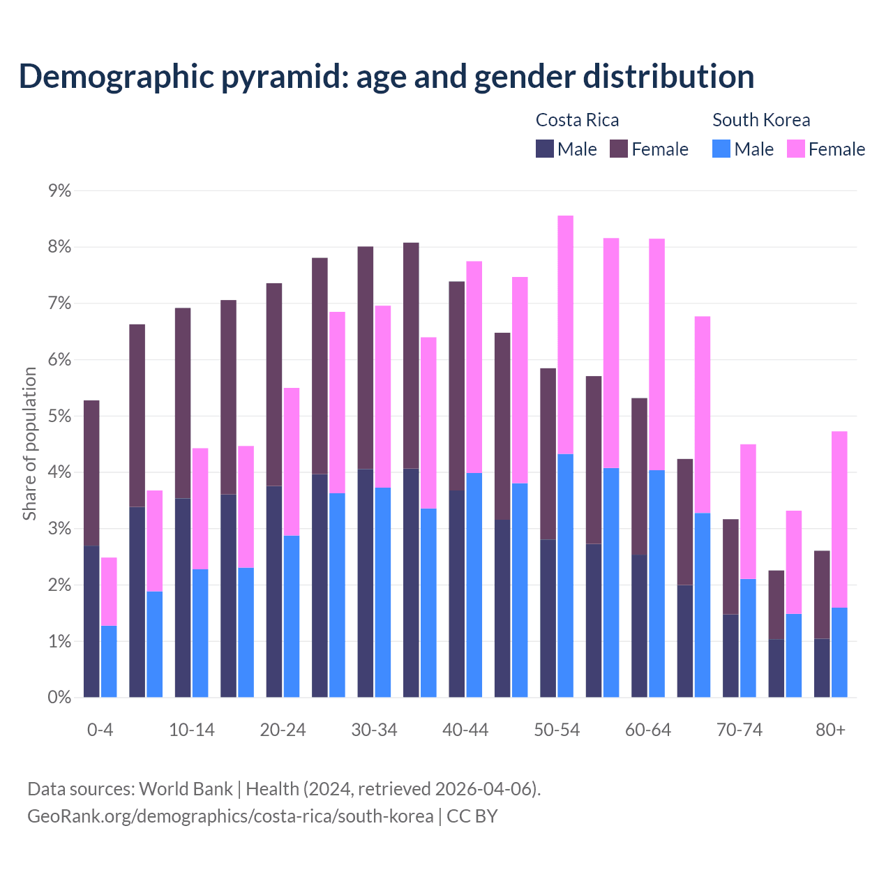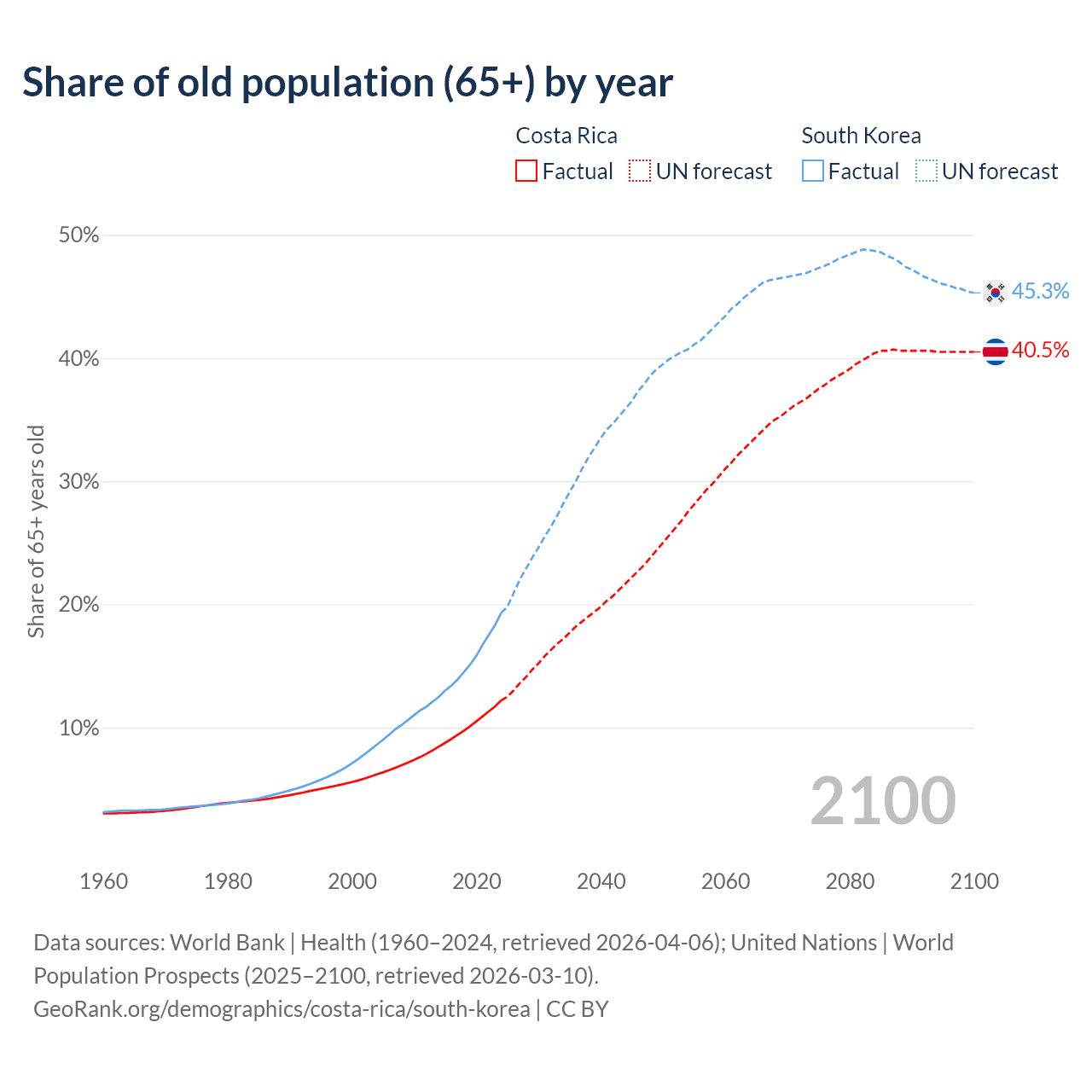 The share of older people aged 65 and over is 12.2% in Costa Rica and 19.3% in South Korea. Life expectancy in Costa Rica compared to South Korea .