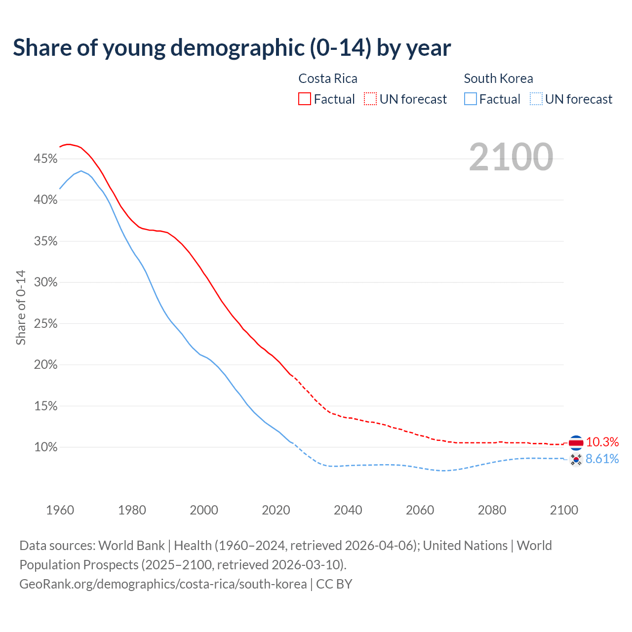 - The share of young demographic (0-15 years old) in Costa Rica is 18.8% vs 10.6% in South Korea.