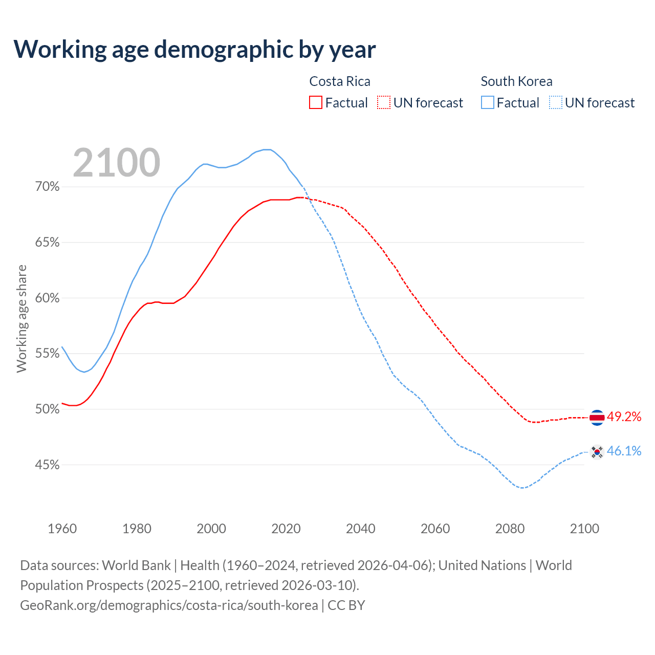 Median age Costa Rica vs South Korea, 1960-2100