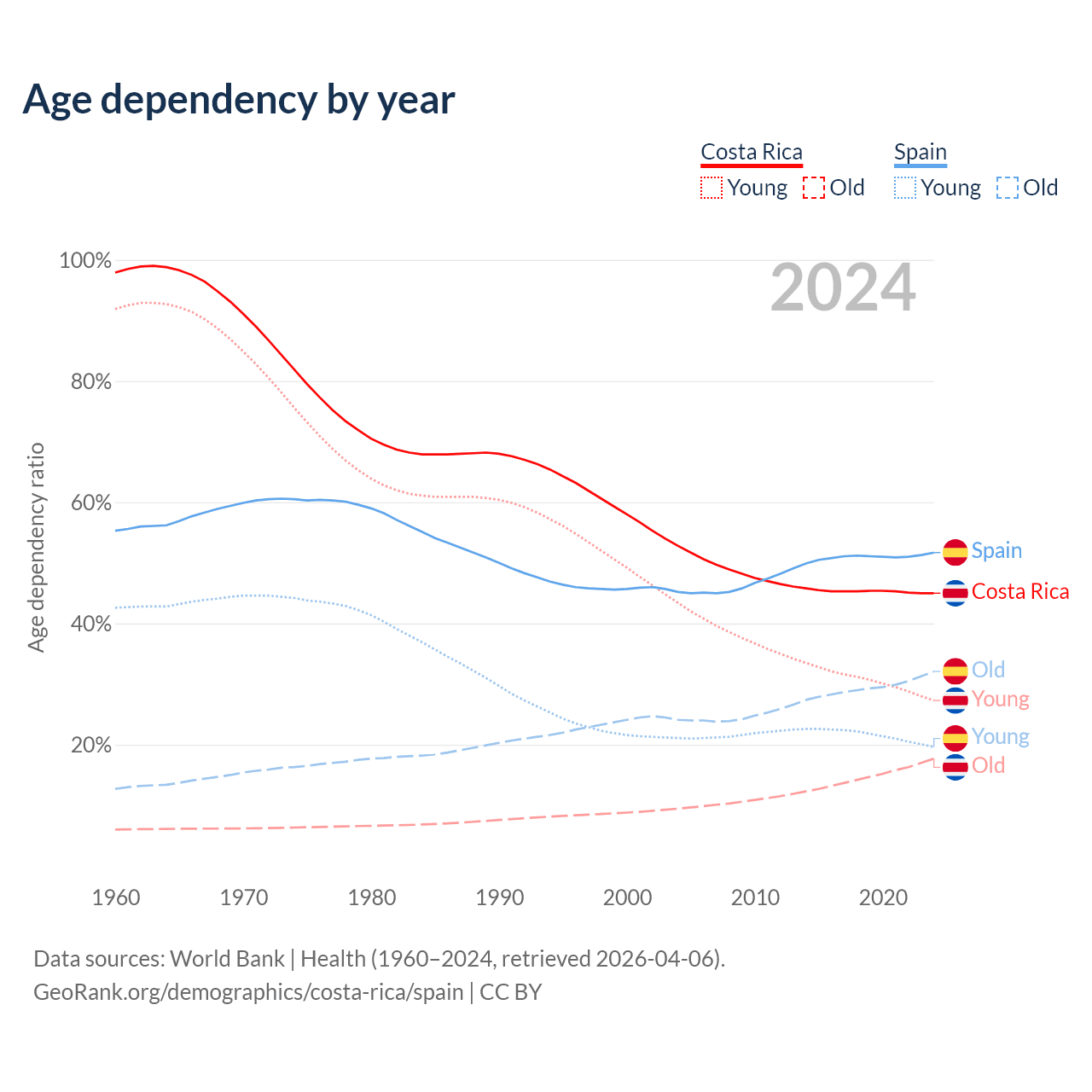 Data sources: World Bank | Health (1960–2024, retrieved 2026-04-06); U.S. Census Bureau (1960–2024, retrieved 2026-02-08).