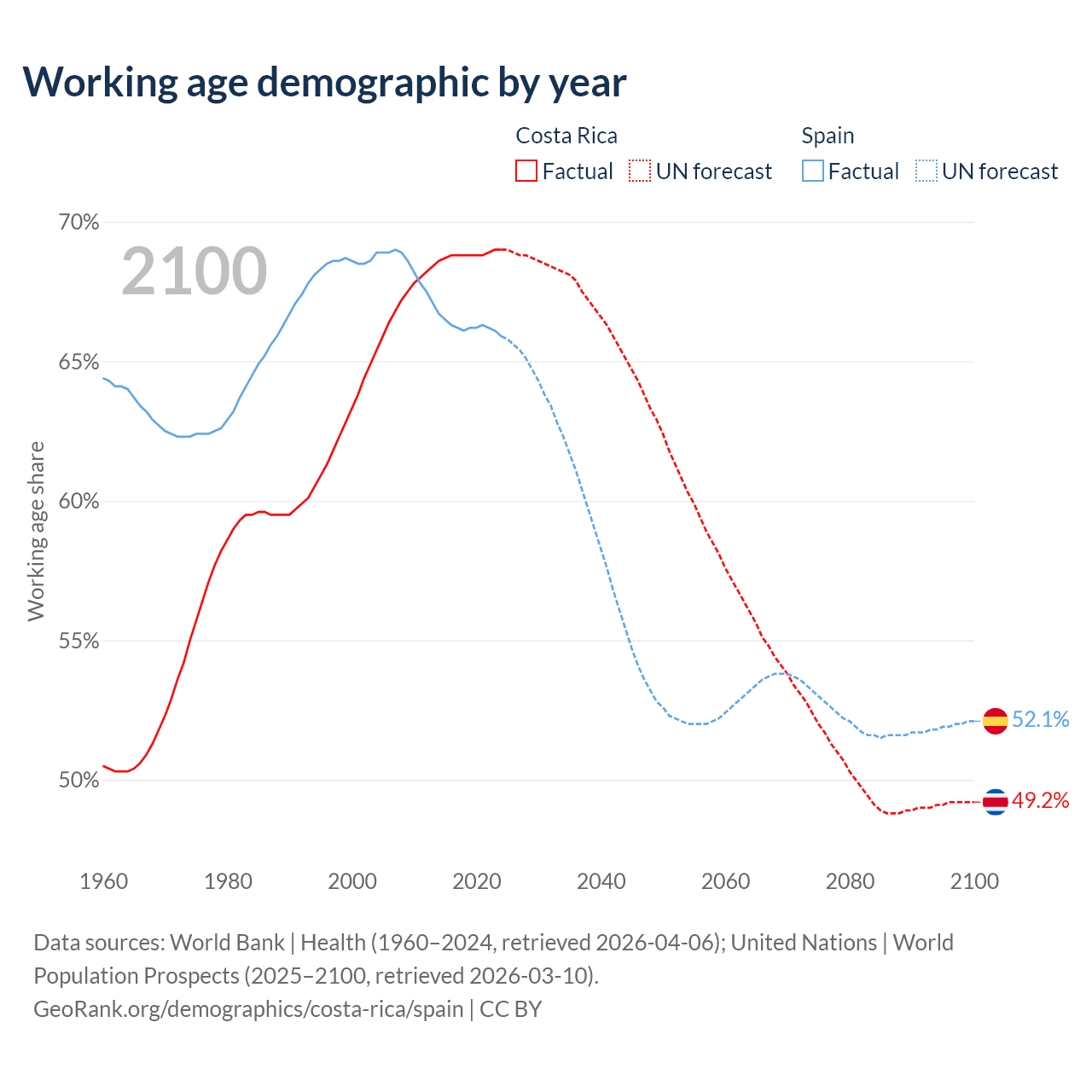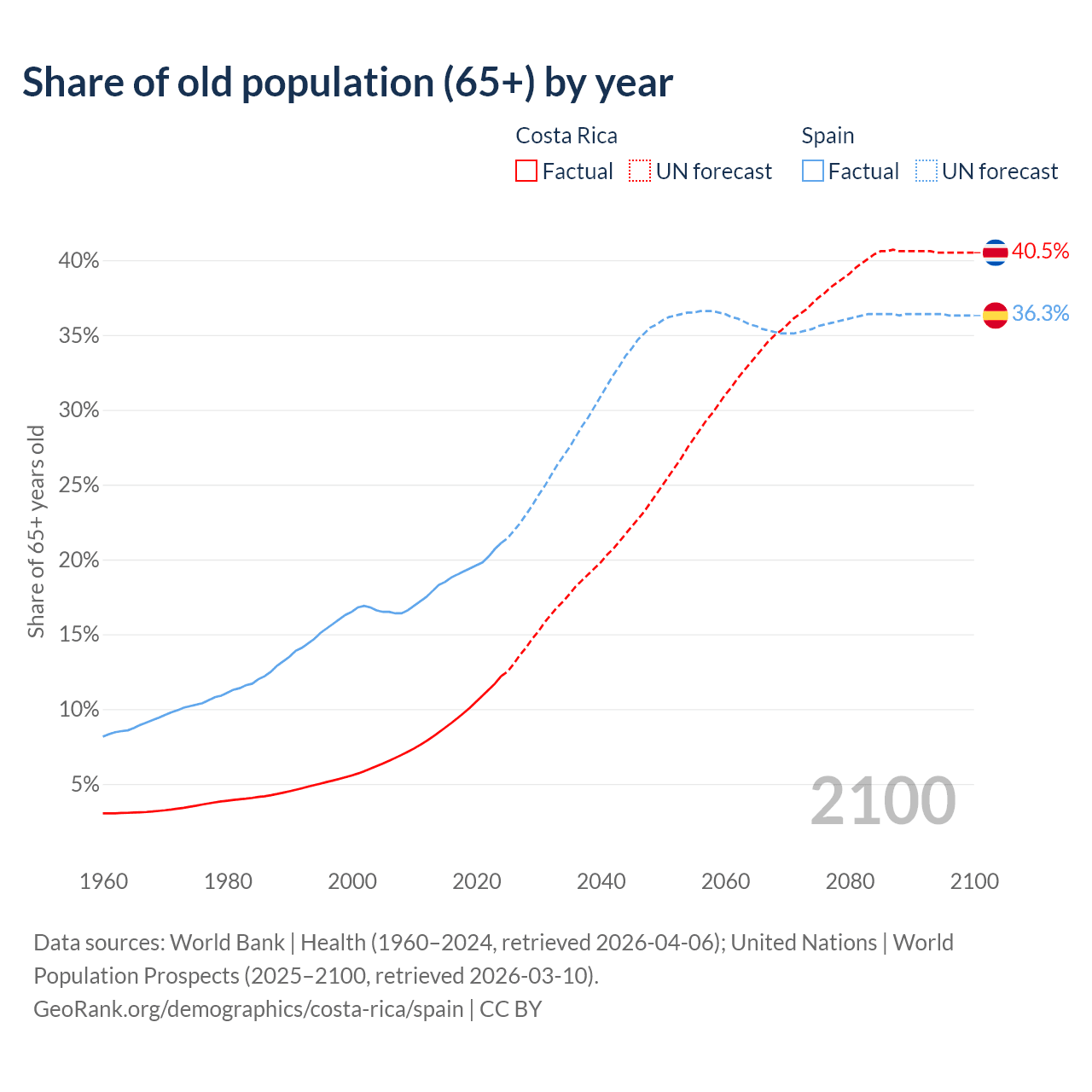 The share of older people aged 65 and over is 12.2% in Costa Rica and 21.1% in Spain. Life expectancy in Costa Rica compared to Spain .