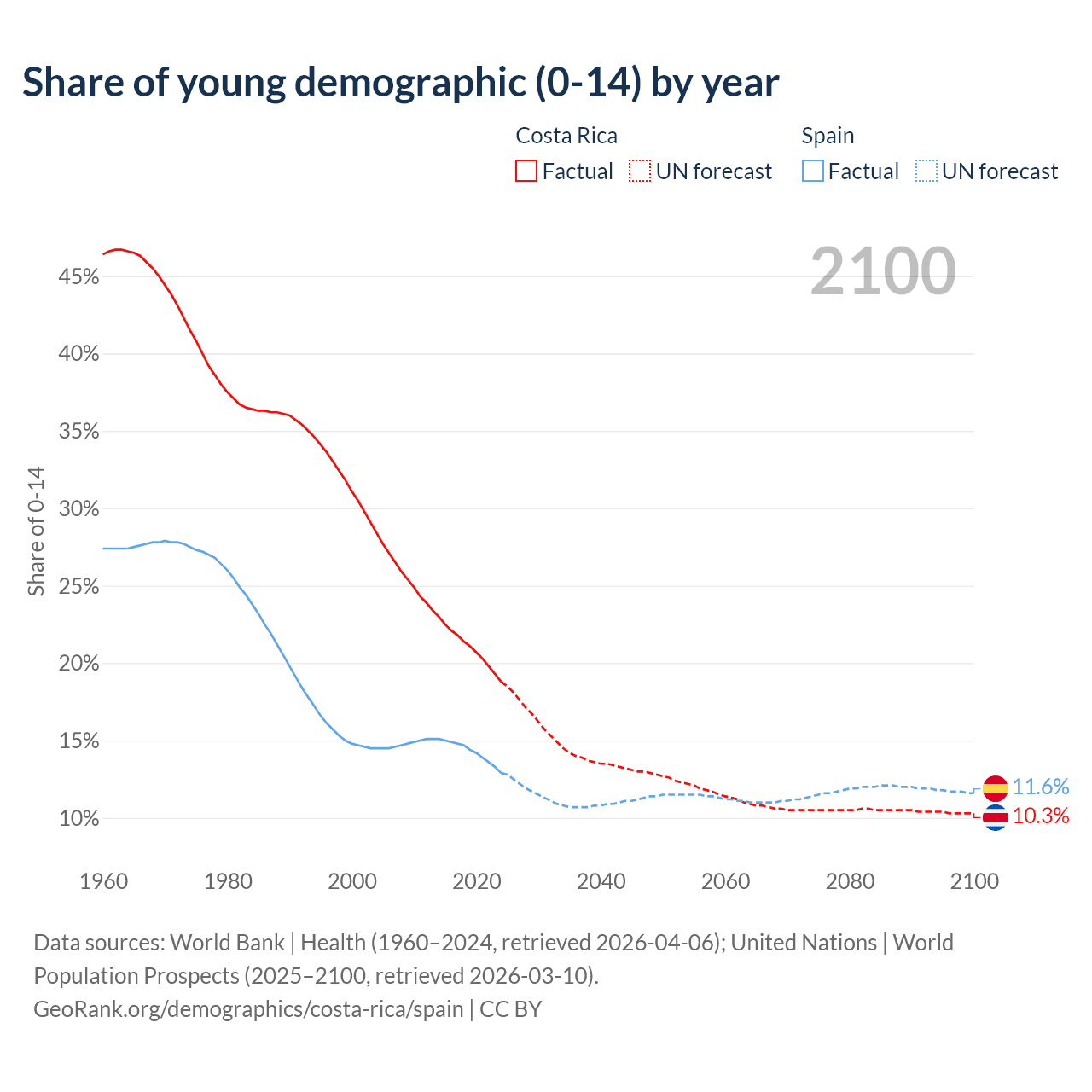 - The share of young demographic (0-15 years old) in Costa Rica is 18.8% vs 12.9% in Spain.