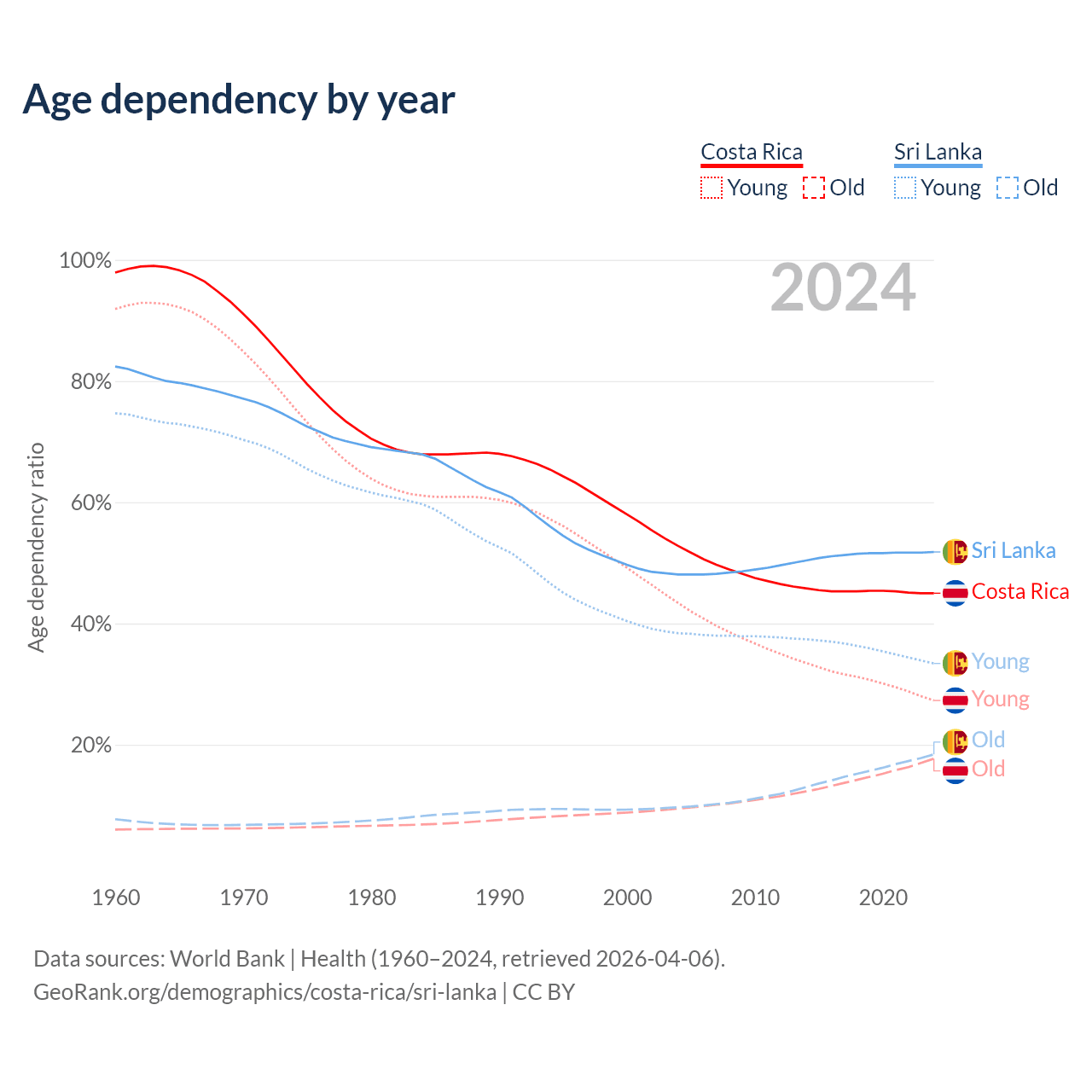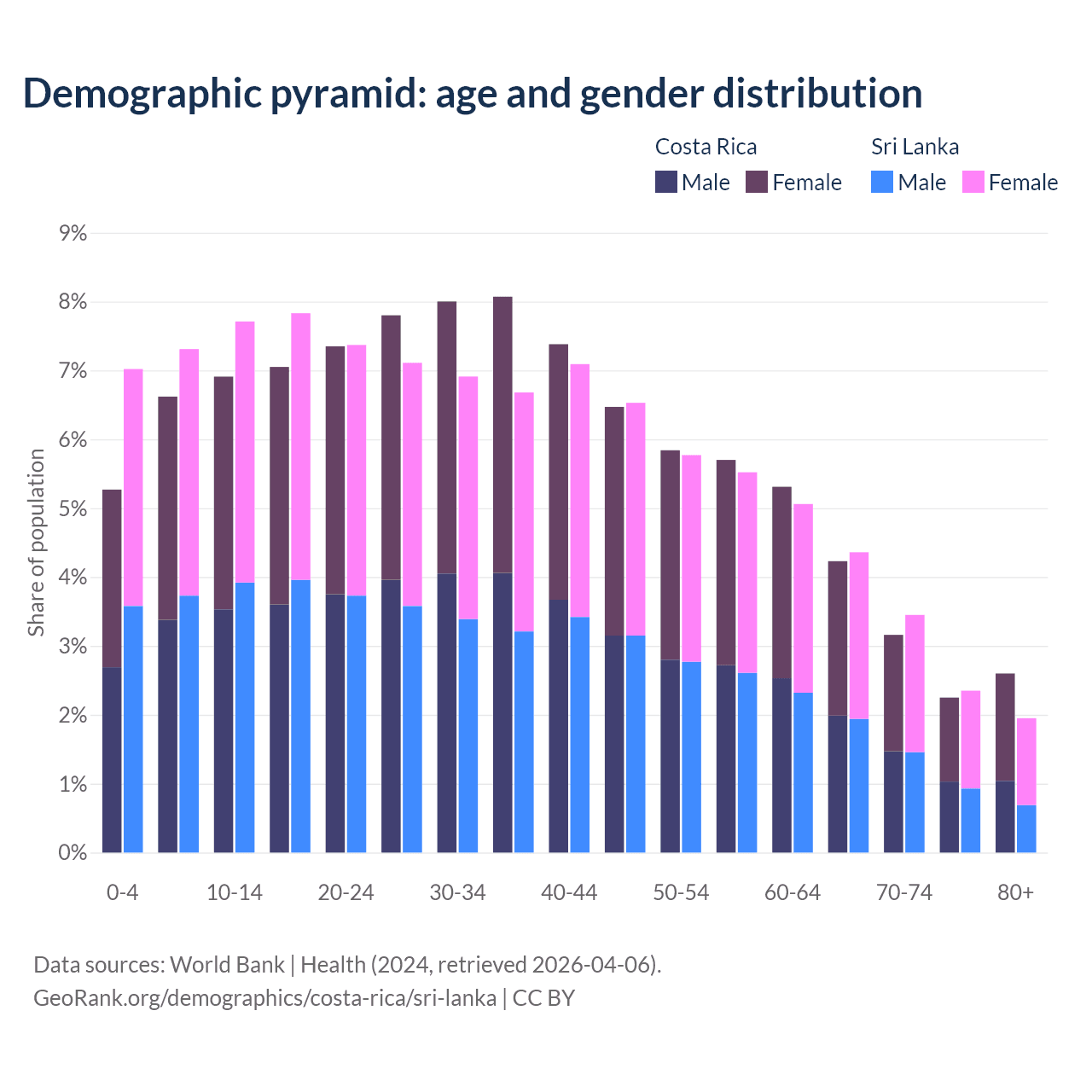 - Costa Rica is ranked 72/196 by median age (oldest to youngest) vs 81/196 for Sri Lanka.