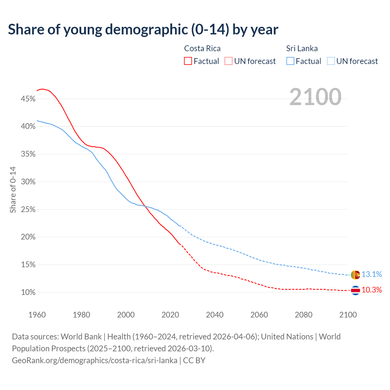- The share of young demographic (0-15 years old) in Costa Rica is 18.8% vs 22% in Sri Lanka.