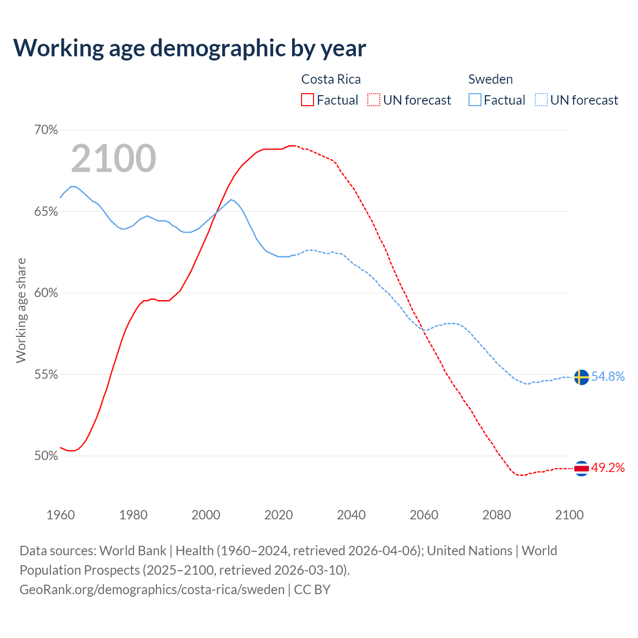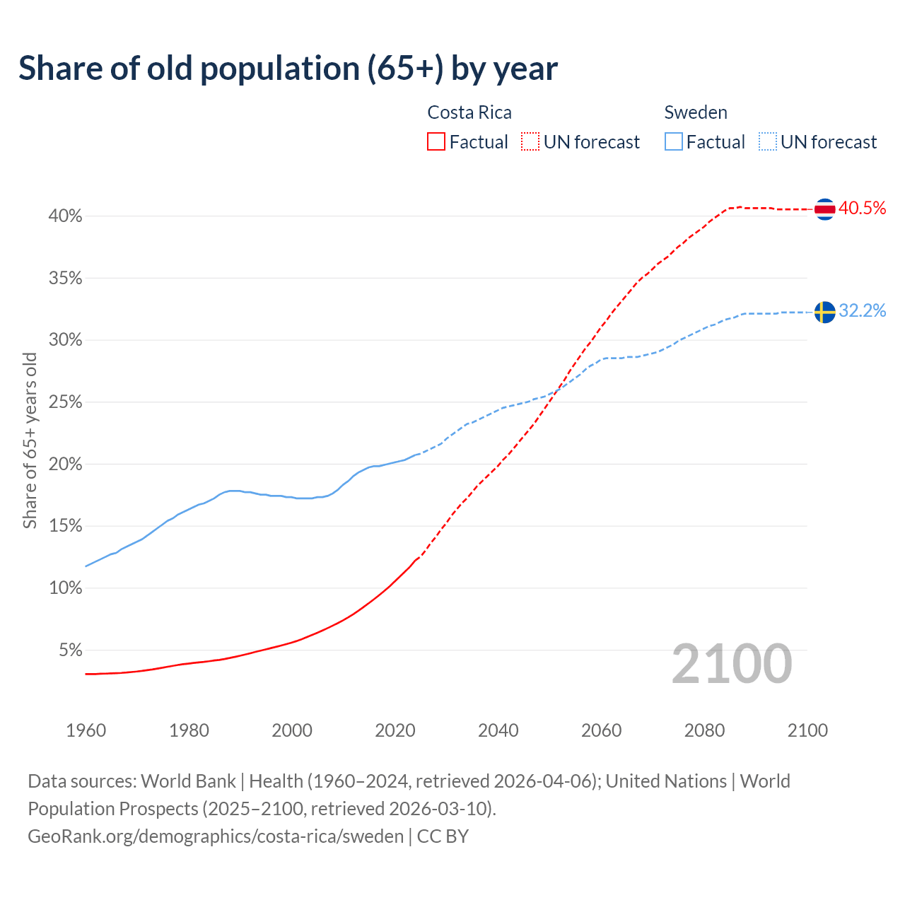 Median age Costa Rica vs Sweden, 1960-2100