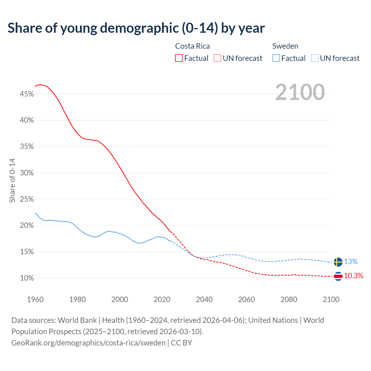 - The share of young demographic (0-15 years old) in Costa Rica is 18.8% vs 17% in Sweden.