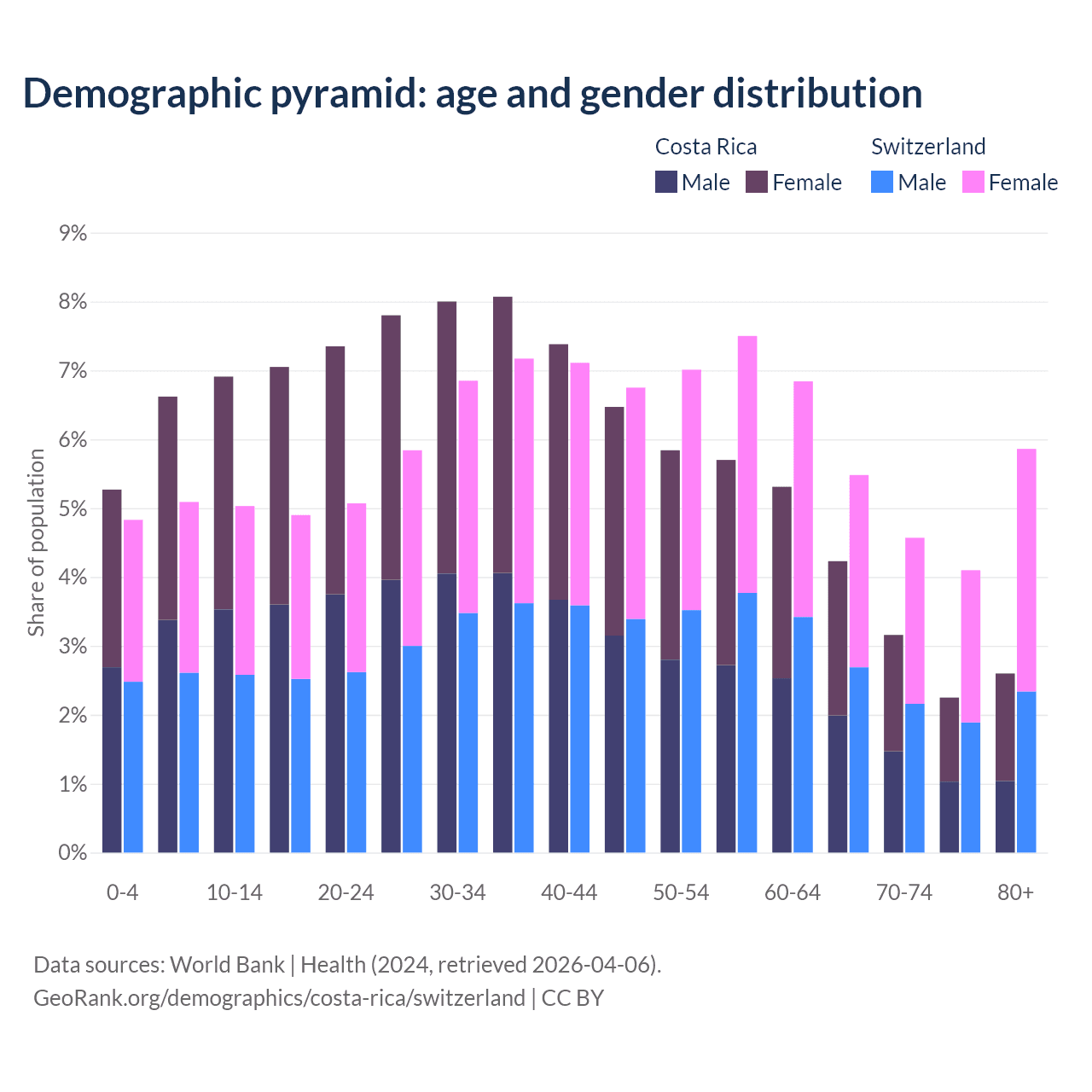 The share of older people aged 65 and over is 12.2% in Costa Rica and 20% in Switzerland. Life expectancy in Costa Rica compared to Switzerland .