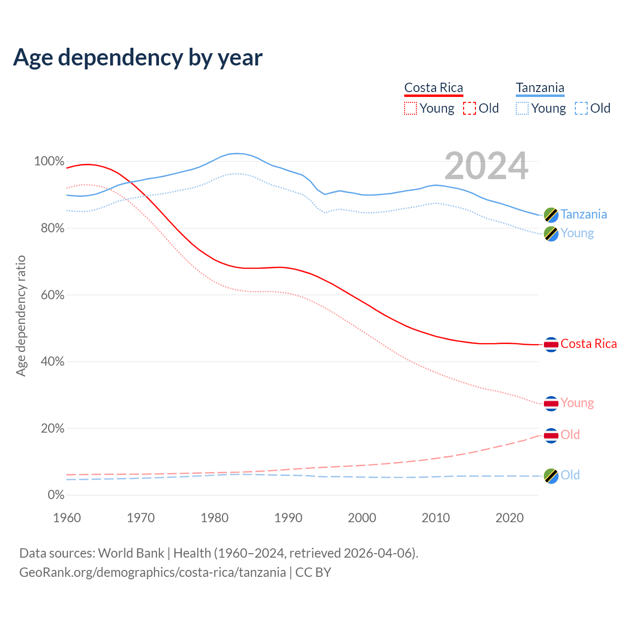 Data sources: World Bank | Health (1960–2024, retrieved 2026-04-06); U.S. Census Bureau (1960–2024, retrieved 2026-02-08).